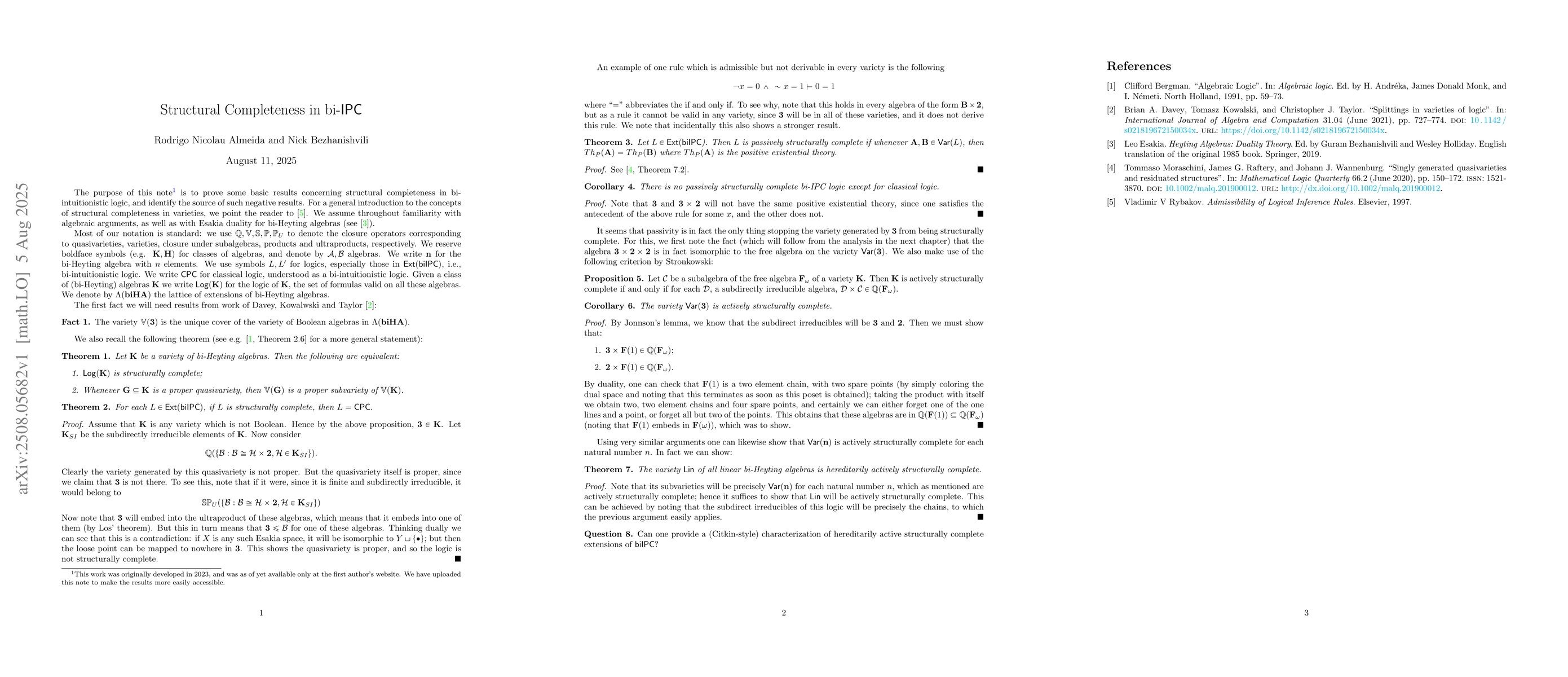 In this note we show that no extension of bi-intuitionistic logic, except for classical logic, is structurally complete; indeed, none of them are passively structurally complete. A direct proof of active structural completeness is given for some simple systems.