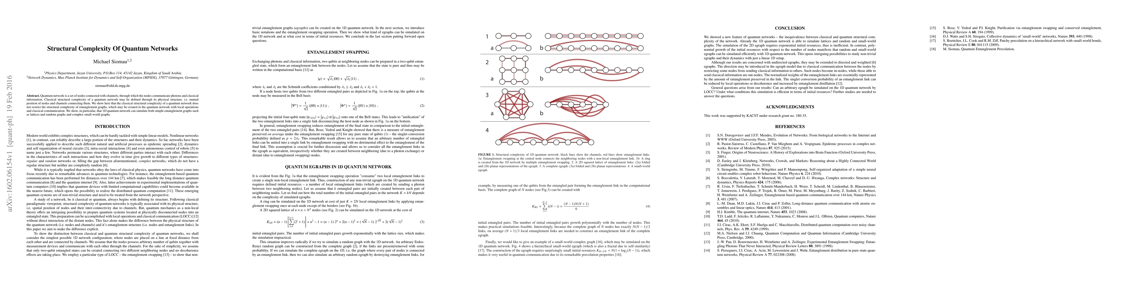 Quantum network is a set of nodes connected with channels, through which the nodes communicate photons and classical information. Classical structural complexity of a quantum network may be defined through its physical structure, i.e. mutual position of nodes and channels connecting them. We show here that the classical structural complexity of a quantum network does not restrict the structural complexity of entanglement graphs, which may be created in the quantum network with local operations and classical communication. We show, in particular, that 1D quantum network can simulate both simple entanglement graphs such as lattices and random graphs and complex small-world graphs.