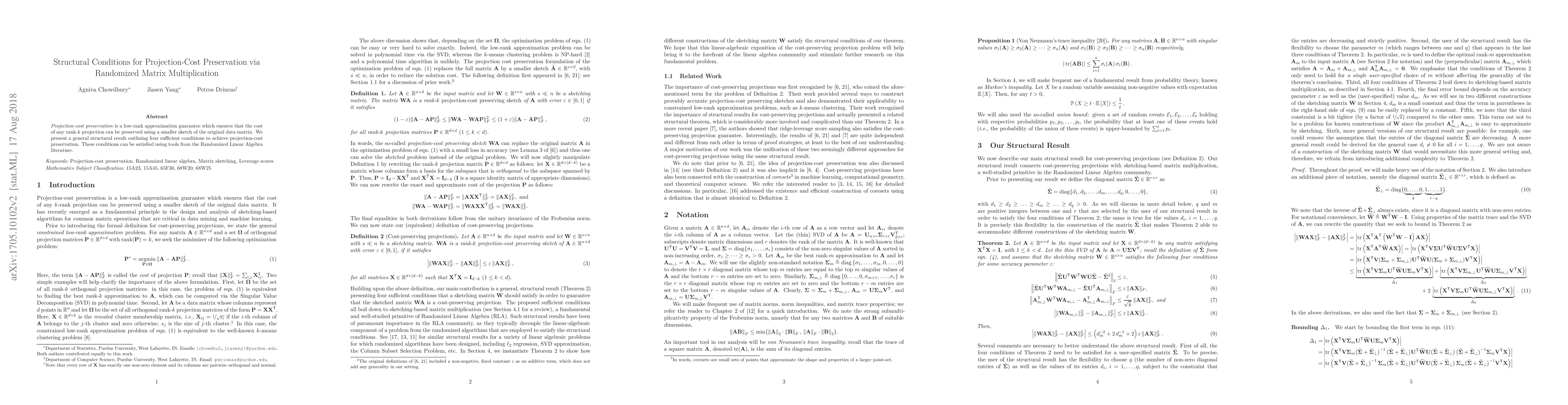 Researchers have identified four structural conditions for preserving projection-cost preservation using randomized matrix multiplication, enabling efficient low-rank approximations of data matrices.