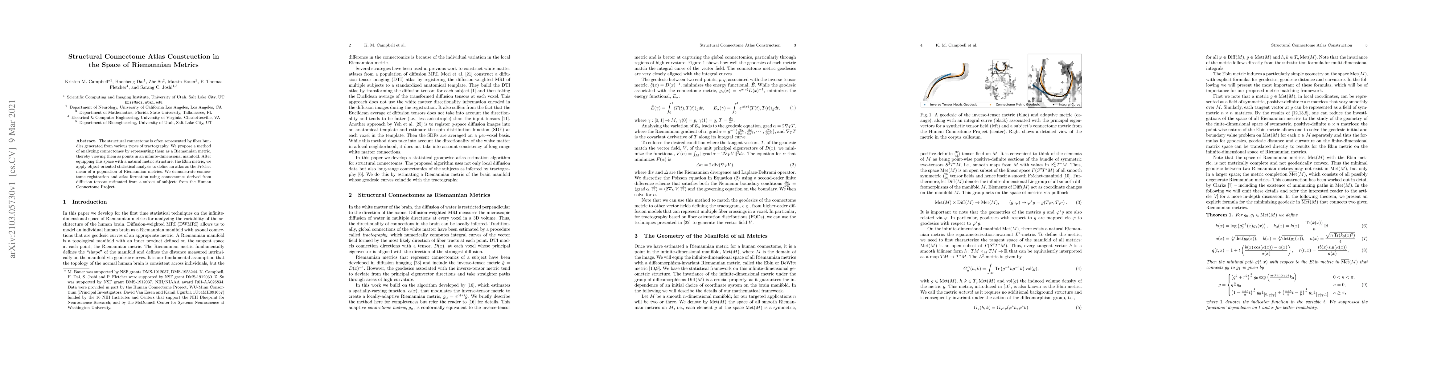 The structural connectome is often represented by fiber bundles generated from various types of tractography. We propose a method of analyzing connectomes by representing them as a Riemannian metric, thereby viewing them as points in an infinite-dimensional manifold. After equipping this space with a natural metric structure, the Ebin metric, we apply object-oriented statistical analysis to define an atlas as the Fr\'echet mean of a population of Riemannian metrics. We demonstrate connectome registration and atlas formation using connectomes derived from diffusion tensors estimated from a subset of subjects from the Human Connectome Project.