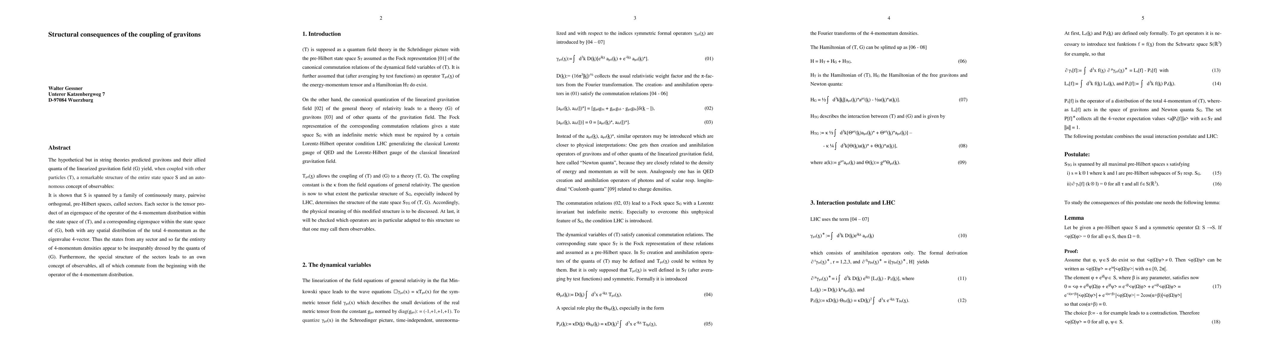 The hypothetical but in string theories predicted gravitons and their allied quanta of the linearized gravitation field G yield, when coupled with other particles T, a remarkable structure of the entire state space S and an autonomous concept of observables. It is shown that S is spanned by a family of continuously many, pairwise orthogonal, pre-Hilbert spaces, called sectors. Each sector is the tensor product of an eigenspace of the operator of the 4-momentum distribution within the state space of T, and a corresponding eigenspace within the state space of G, both with any spatial distribution of the total 4-momentum as the eigenvalue 4-vector. Thus the states from any sector and so far the entirety of 4-momentum densities appear to be inseparably dressed by the quanta of G. Probably this dressing contributes to the dark matter. Furthermore, the special structure of the sectors lead to an own concept of observables, all of which commute from the beginning with the operator of the 4-momentum distribution.