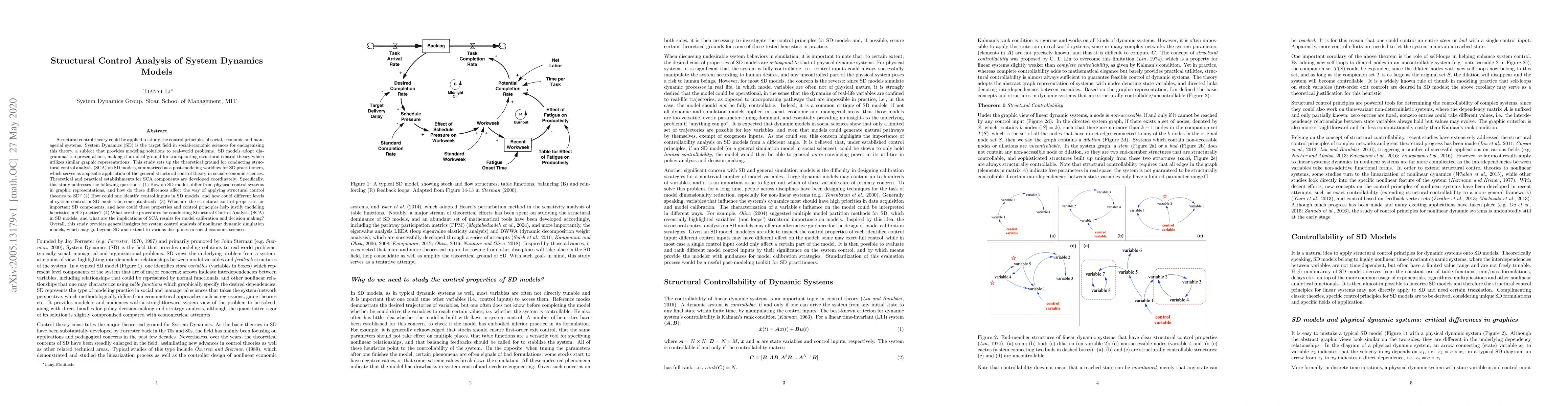 Structural control theory could be applied to study the control principles of social, economic and managerial systems. System Dynamics (SD) is the target field in social-economic sciences for endogenizing this theory, a subject that provides modeling solutions to real-world problems. SD models adopt diagrammatic representations, making it an ideal ground for transplanting structural control theory which utilizes similar graphic representations. This study sets up the theoretical ground for conducting structural control analysis (SCA) on SD models, summarized as a post-modeling workflow for SD practitioners, which serves as a specific application of the general structural control theory in social-economic sciences. Theoretical and practical establishments for SCA components are developed coordinately. Specifically, this study addresses the following questions: (1) How do SD models differ from physical control systems in graphic representations, and how do these differences affect the way of applying structural control theories to SD? (2) How could one identify control inputs in SD models, and how could different levels of system control in SD models be conceptualized? (3) What are the structural control properties for important SD components, and how could these properties and control principles help justify modeling heuristics in SD practice? (4) What are the procedures for conducting Structural Control Analysis (SCA) in SD models, and what are the implications of SCA results for model calibration and decision making? Overall, this study provides general insights for system control analysis of nonlinear dynamic simulation models, which may go beyond SD and extend to various disciplines in social-economic sciences.