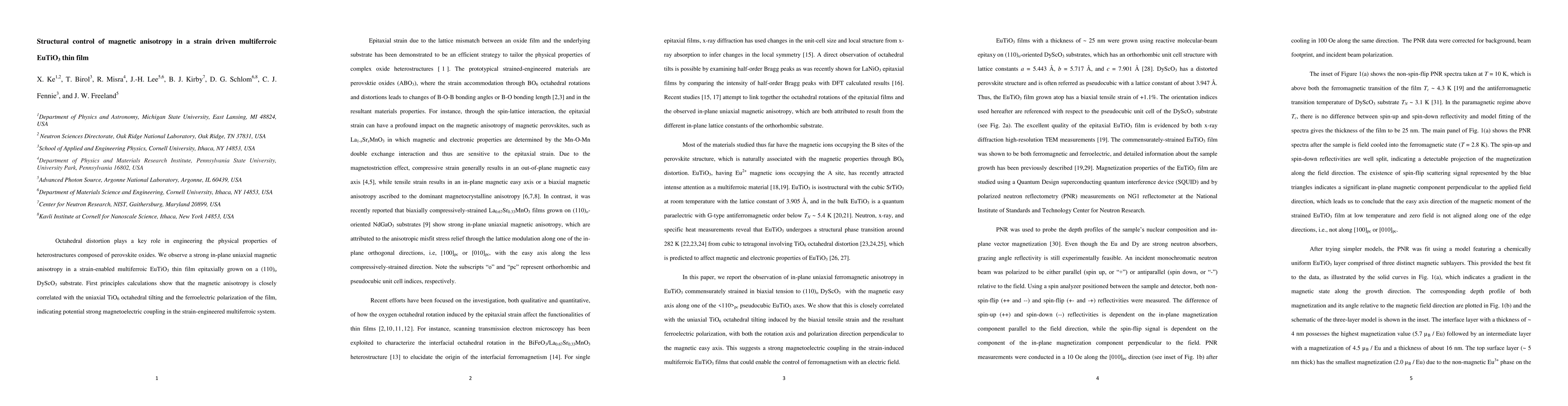 This study investigates a strain-driven multiferroic EuTiO3 thin film, revealing strong in-plane uniaxial magnetic anisotropy correlated with TiO6 octahedral tilting and ferroelectric polarization, suggesting significant magnetoelectric coupling potential. First principles calculations support the structural control of magnetic anisotropy through octahedral distortion in the epitaxial film.