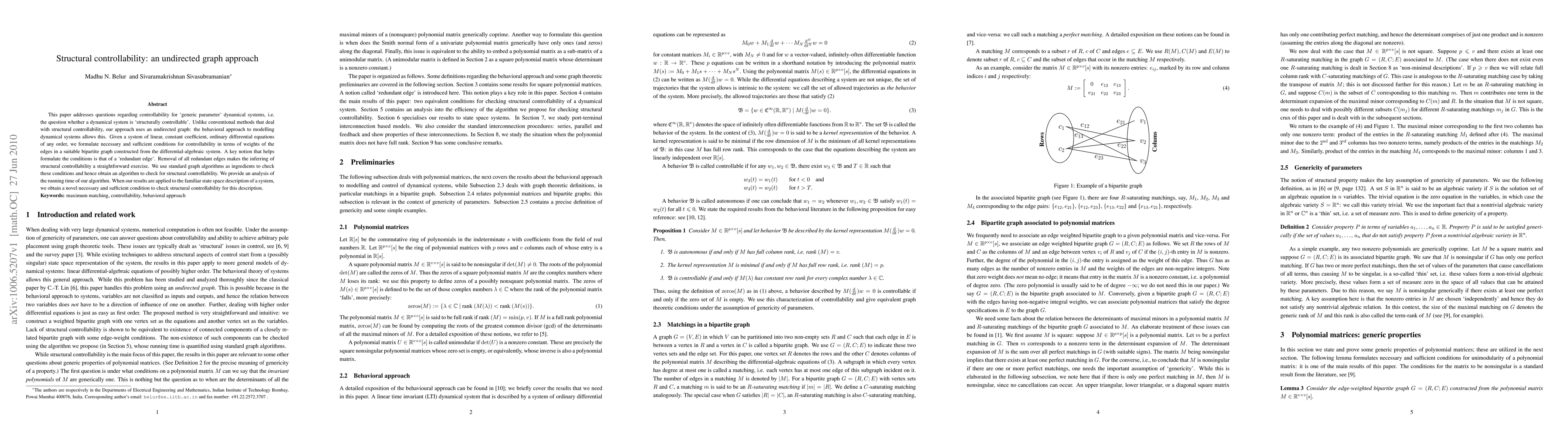 This paper addresses questions regarding controllability for `generic parameter' dynamical systems, i.e. the question whether a dynamical system is `structurally controllable'. Unlike conventional methods that deal with structural controllability, our approach uses an undirected graph: the behavioral approach to modelling dynamical systems allows this. Given a system of linear, constant coefficient, ordinary differential equations of any order, we formulate necessary and sufficient conditions for controllability in terms of weights of the edges in a suitable bipartite graph constructed from % components with equal bipartite cardinality in the differential-algebraic system. % of equations. A key notion that helps formulate the conditions is that of a `redundant edge'. Removal of all redundant edges makes the inferring of structural controllability a straightforward exercise. We use standard graph algorithms as ingredients to check these conditions and hence obtain an algorithm to check for structural controllability. We provide an analysis of the running time of our algorithm. When our results are applied to the familiar state space description of a system, we obtain a novel necessary and sufficient condition to check structural controllability for this description.
