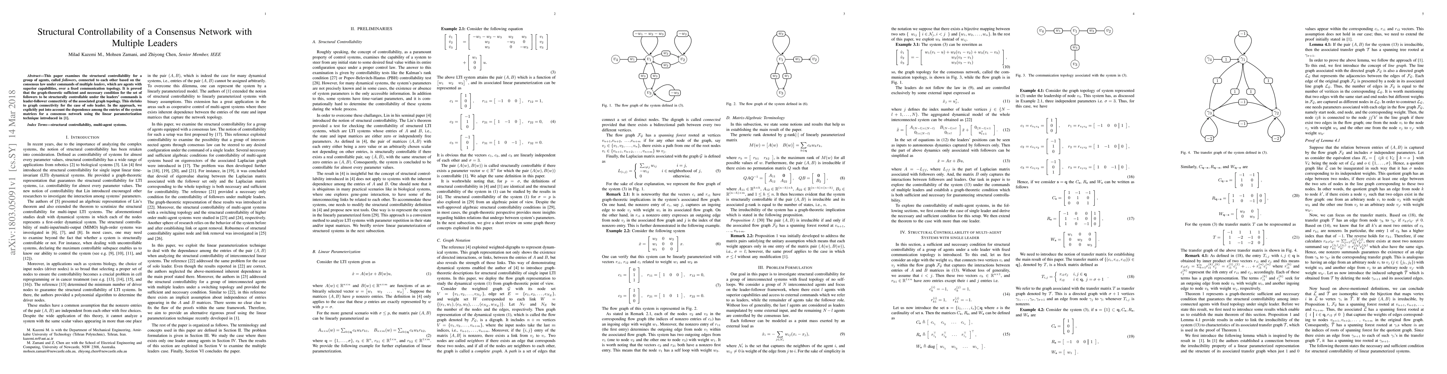 This research establishes a condition for controlling a network of followers by multiple leaders, proving that leader-follower connectivity in the graph topology ensures structural controllability. The method uses linear parameterization to consider matrix entry dependencies in a consensus network.
