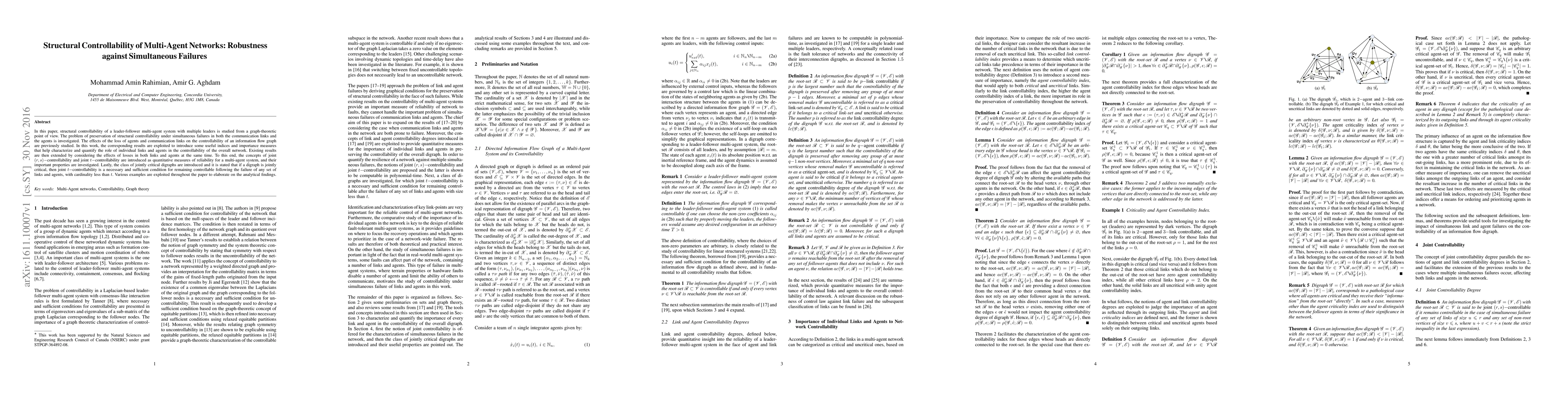 In this paper, structural controllability of a leader-follower multi-agent system with multiple leaders is studied from a graph-theoretic point of view. The problem of preservation of structural controllability under simultaneous failures in both the communication links and the agents is investigated. The effects of the loss of agents and communication links on the controllability of an information flow graph are previously studied. In this work, the corresponding results are exploited to introduce some useful indices and importance measures that help characterize and quantify the role of individual links and agents in the controllability of the overall network. Existing results are then extended by considering the effects of losses in both links and agents at the same time. To this end, the concepts of joint (r,s)-controllability and joint t-controllability are introduced as quantitative measures of reliability for a multi-agent system, and their important properties are investigated. Lastly, the class of jointly critical digraphs is introduced and it is stated that if a digraph is jointly critical, then joint t-controllability is a necessary and sufficient condition for remaining controllable following the failure of any set of links and agents, with cardinality less than t. Various examples are exploited throughout the paper to elaborate on the analytical findings.