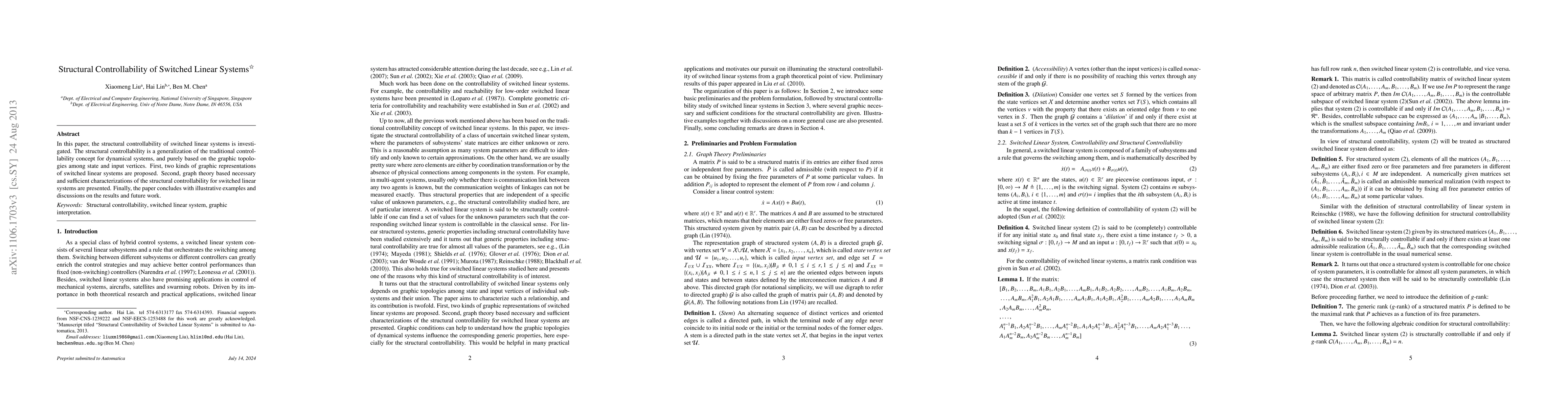 The paper presents novel graphic conditions for structural controllability of switched linear systems, including the introduction of S-disjoint edges as a more numerically efficient criterion compared to S-dilation.