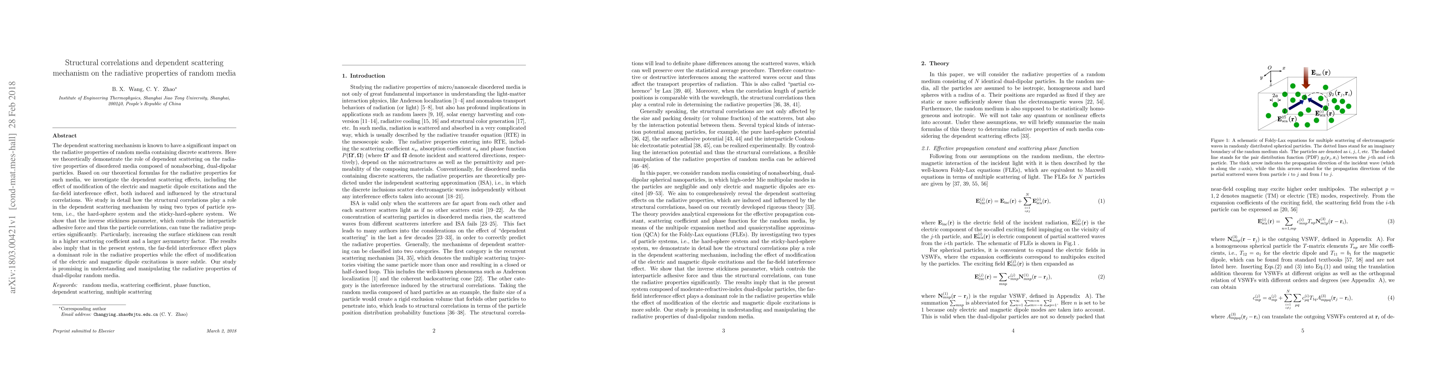 This paper theoretically investigates the influence of dependent scattering mechanisms on the radiative properties of disordered media composed of nonabsorbing, dual-dipolar particles. The study reveals that structural correlations, controlled by the inverse stickiness parameter, significantly tune the radiative properties, with higher stickiness leading to increased scattering and asymmetry.