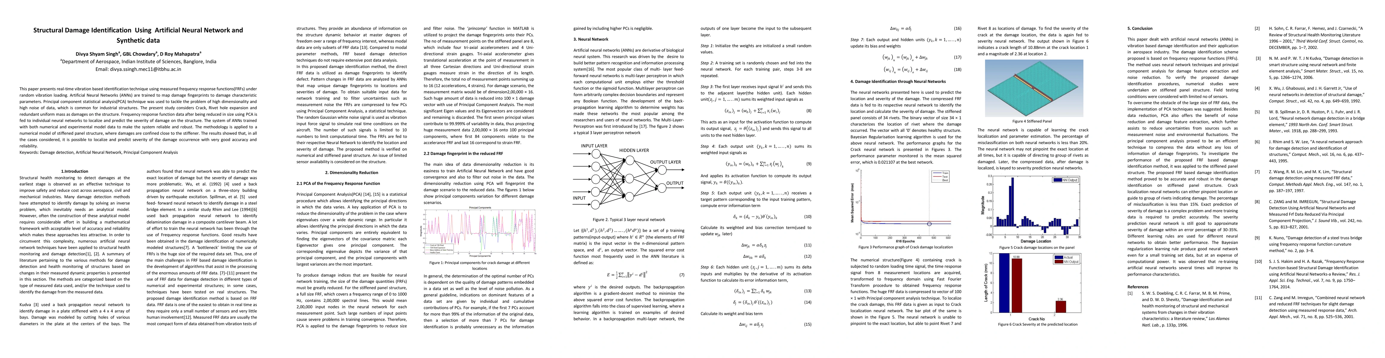 This paper uses Artificial Neural Networks (ANNs) trained on synthetic and experimental data to identify structural damage in real-time via vibration-based frequency response functions, achieving high accuracy in localizing and predicting damage severity. Principal Component Analysis (PCA) reduces data dimensionality and noise, enhancing the reliability of the ANN-based damage identification system.
