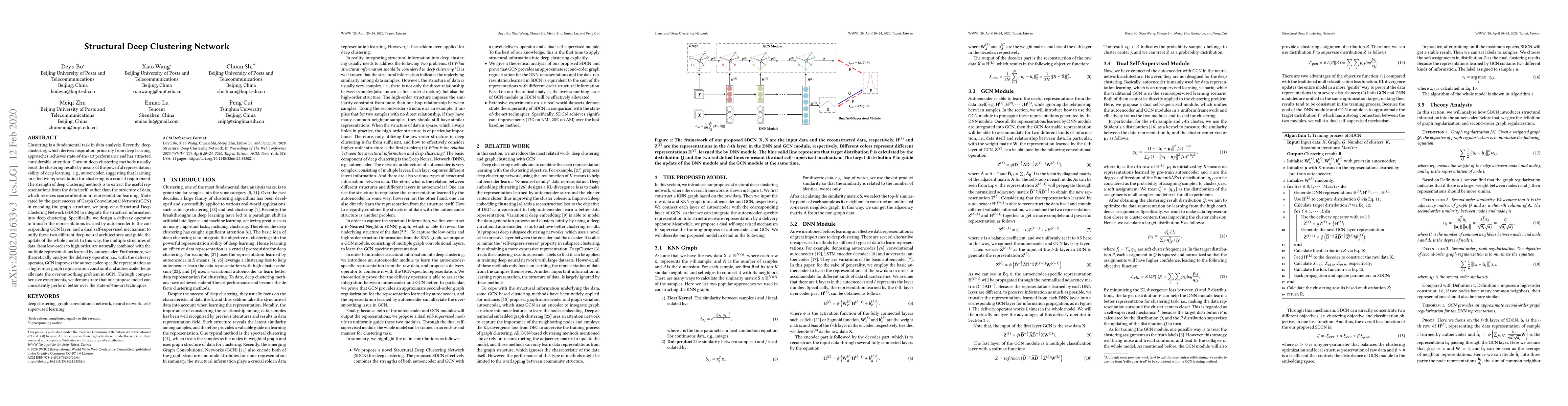 The Structural Deep Clustering Network (SDCN) integrates structural data information with deep clustering to enhance representation learning. It combines an autoencoder with a Graph Convolutional Network (GCN) to leverage both low-order and high-order data structures, achieving superior clustering performance compared to state-of-the-art methods.