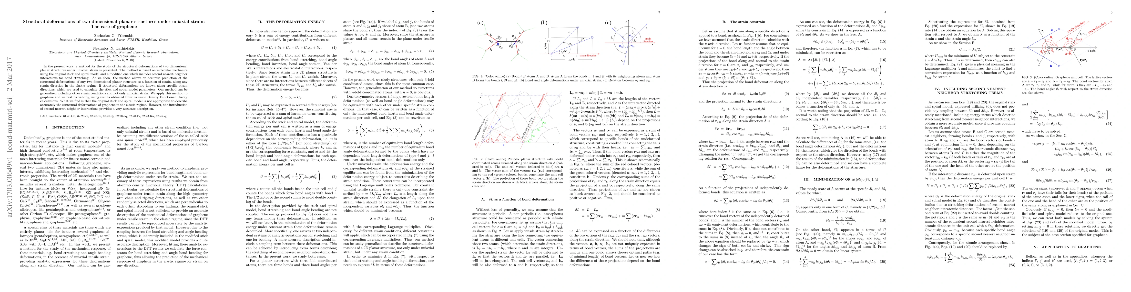 In the present work, a method for the study of the structural deformations of two dimensional planar structures under uniaxial strain is presented. The method is based on molecular mechanics using the original stick and spiral model and a modified one which includes second nearest neighbor interactions for bond stretching. As we show, the method allows an accurate prediction of the structural deformations of any two dimensional planar structure as a function of strain, along any strain direction in the elastic regime, if structural deformations are known along specific strain directions, which are used to calculate the stick and spiral model parameters. Our method can be generalized including other strain conditions and not only uniaxial strain. We apply this method to graphene and we test its validity, using results obtained from {\it ab initio} Density Functional Theory calculations. What we find is that the original stick and spiral model is not appropriate to describe accurately the structural deformations of graphene in the elastic regime. However, the introduction of second nearest neighbor interactions provides a very accurate description.