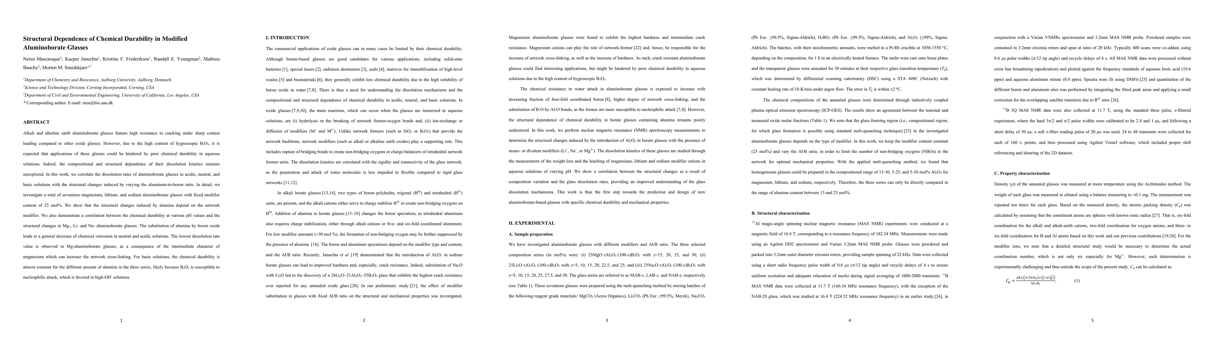 Alkali and alkaline earth aluminoborate glasses feature high resistance to cracking under sharp contact loading compared to other oxide glasses. However, due to the high content of hygroscopic B2O3, it is expected that applications of these glasses could be hindered by poor chemical durability in aqueous solutions. Indeed, the compositional and structural dependence of their dissolution kinetics remains unexplored. In this work, we correlate the dissolution rates of aluminoborate glasses in acidic, neutral, and basic solutions with the structural changes induced by varying the aluminum-to-boron ratio. In detail, we investigate a total of seventeen magnesium, lithium, and sodium aluminoborate glasses with fixed modifier content of 25 mol%. We show that the structural changes induced by alumina depend on the network modifier. We also demonstrate a correlation between the chemical durability at various pH values and the structural changes in Mg-, Li- and Na- aluminoborate glasses. The substitution of alumina by boron oxide leads to a general decrease of chemical corrosion in neutral and acidic solutions. The lowest dissolution rate value is observed in Mg-aluminoborate glasses, as a consequence of the intermediate character of magnesium which can increase the network cross-linking. For basic solutions, the chemical durability is almost constant for the different amount of alumina in the three series, likely because B2O3 is susceptible to nucleophilic attack, which is favored in high-OH- solutions.