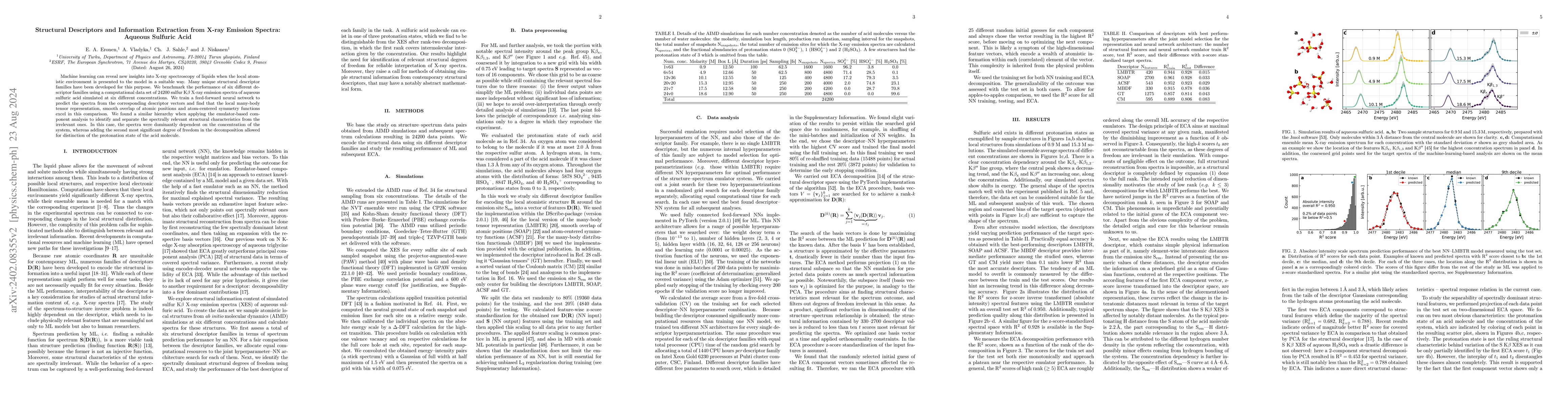 This study benchmarks six structural descriptor types for predicting X-ray spectra of aqueous sulfuric acid using machine learning. The local many-body tensor representation, smooth overlap of atomic positions, and atom-centered symmetry functions proved most effective, with concentration being the primary spectral determinant and protonation state the secondary factor.