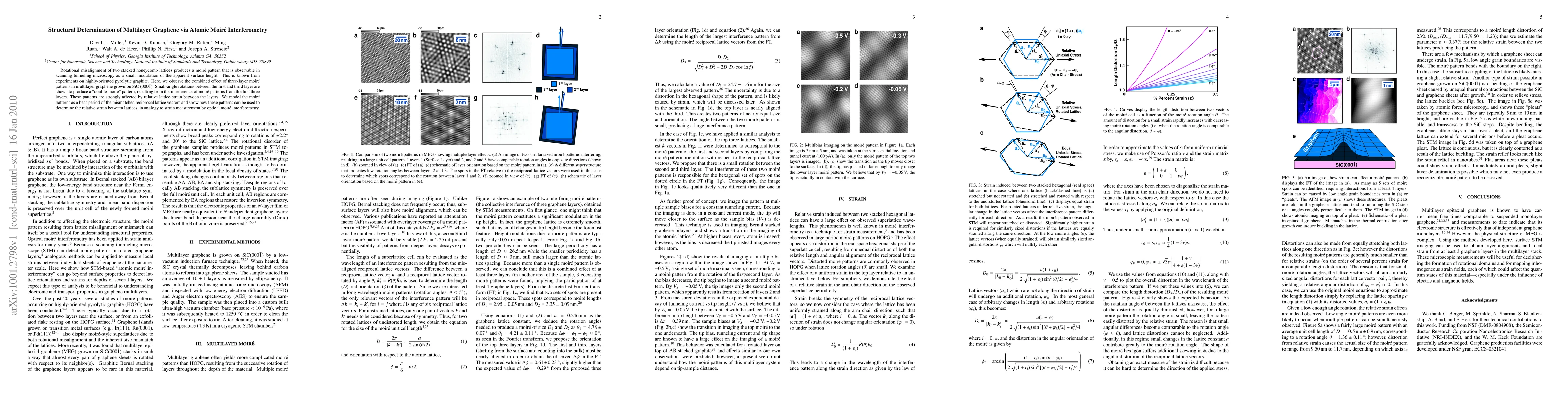 This paper investigates the structural determination of multilayer graphene using atomic moiré interferometry, revealing "double-moir\'e" patterns from small-angle rotations in the first and third layers. The study demonstrates how these patterns, influenced by relative lattice strain, can be modeled to measure interlayer strain.