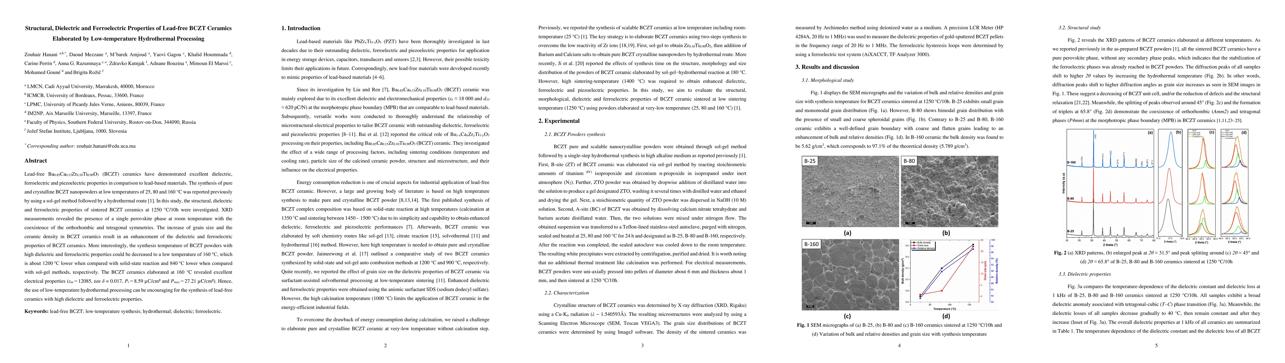 This study investigates the structural, dielectric, and ferroelectric properties of lead-free BCZT ceramics synthesized via low-temperature hydrothermal processing. The BCZT ceramics exhibited enhanced dielectric and ferroelectric properties due to increased grain size and ceramic density, with optimal properties achieved at a synthesis temperature of 160°C.