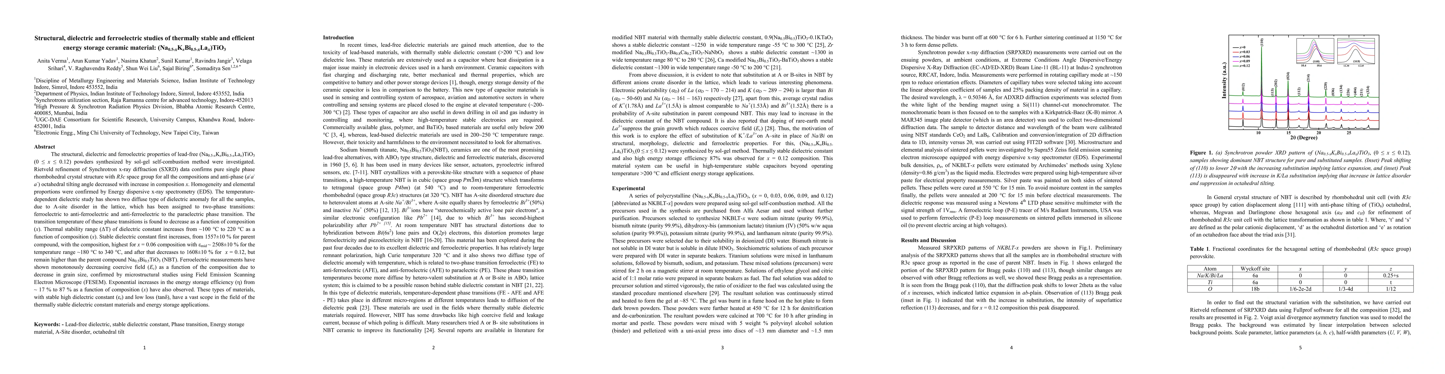 The structural, dielectric and ferroelectric properties of lead-free (Na0.5-xKxBi0.5-xLax)TiO3 powders synthesized by sol-gel self-combustion method were investigated. Rietveld refinement of Synchrotron x-ray diffraction data confirms pure single phase rhombohedral crystal structure with R3c space group for all the compositions and anti-phase octahedral tilting angle decreased with increase in composition x. Homogeneity and elemental proportions were confirmed by Energy dispersive x-ray spectrometry. The temperature-dependent dielectric study has shown two diffuse type of dielectric anomaly for all the samples, due to A-site disorder in the lattice, which has been assigned to two-has transitions: ferroelectric to anti-ferroelectric and anti-ferroelectric to the paraelectric phase transition. The transition temperature of these phase transitions is found to decrease as a function of composition. Thermal stability range of dielectric constant increases from ~100C to 220C as a function of composition. Stable dielectric constant first increases, from 1557 10 % for parent compound, with the composition, highest for 6 % composition with emid ~ 2508 10 % for the temperature range ~180 C to 340C and after that decreases to 1608 10 % for 12 % but remain higher than the parent compound Na0.5Bi0.5TiO3. Ferroelectric measurements have shown monotonously decreasing coercive field as a function of the composition due to a decrease in grain size, confirmed by microstructural studies using Field Emission Scanning Electron Microscope. Exponential increases in the energy storage efficiency from ~ 17 % to 87 % as a function of composition have also observed. These types of materials, with stable high dielectric constant and low tan delta, have a vast scope in the field of the thermally stable dielectric constant materials and energy storage applications.