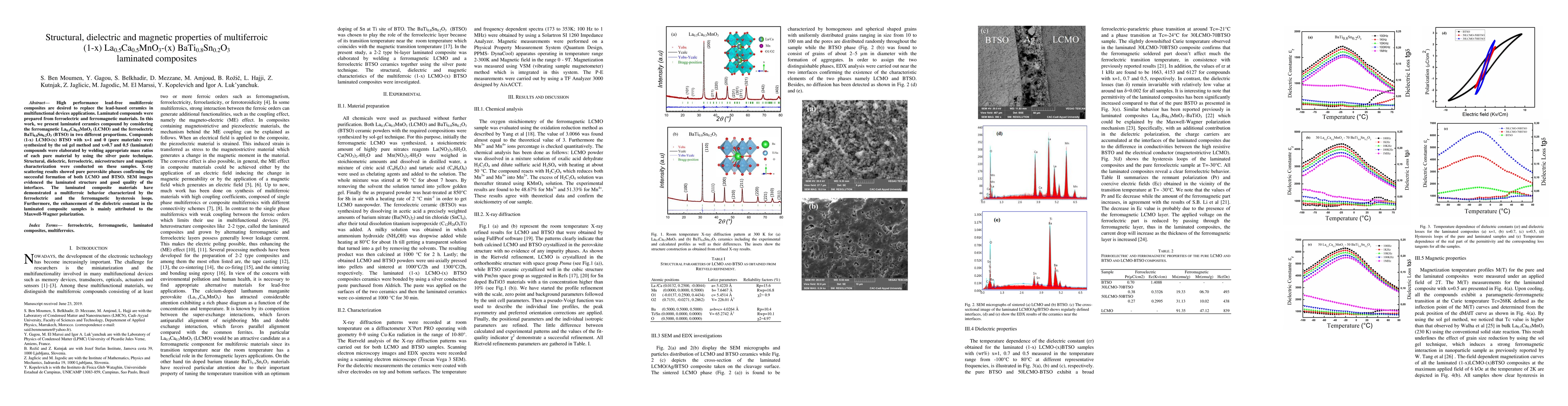 This research investigates the structural, dielectric, and magnetic properties of lead-free multiferroic laminated composites made from La0.5Ca0.5MnO3 and BaTi0.8Sn0.2O3. The composites show successful perovskite phase formation, a laminated structure, and enhanced dielectric properties due to Maxwell-Wagner polarization, alongside demonstrating multiferroic behavior.