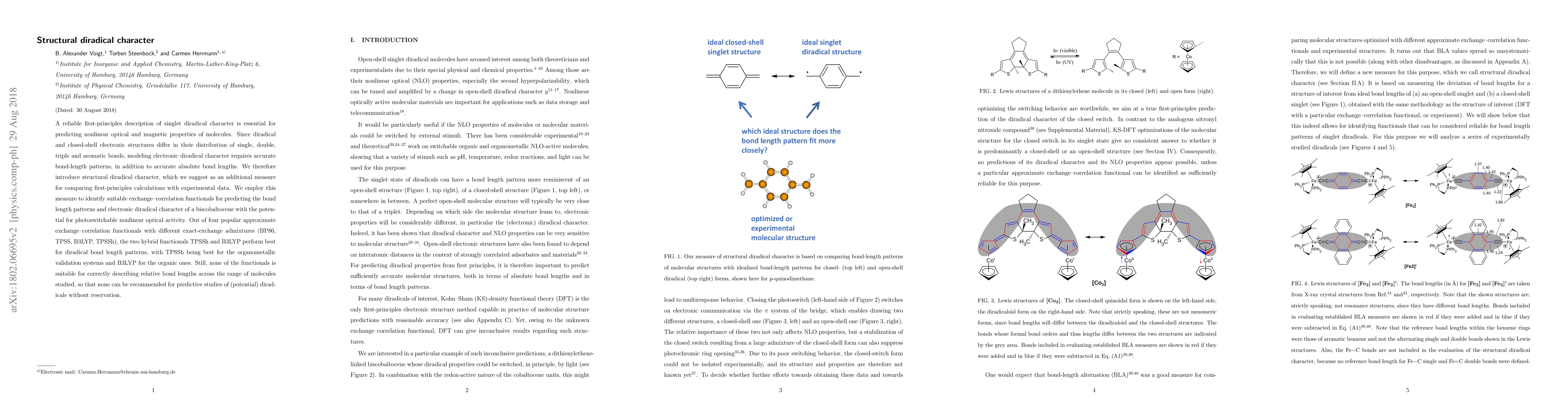 A reliable first-principles description of singlet diradical character is essential for predicting nonlinear optical and magnetic properties of molecules. Since diradical and closed-shell electronic structures differ in their distribution of single, double, triple and aromatic bonds, modeling electronic diradical character requires accurate bond-length patterns, in addition to accurate absolute bond lengths. We therefore introduce structural diradical character, which we suggest as an additional measure for comparing first-principles calculations with experimental data. We employ this measure to identify suitable exchange-correlation functionals for predicting the bond length patterns and electronic diradical character of a biscobaltocene with the potential for photoswitchable nonlinear optical activity. Out of four popular approximate exchange-correlation functionals with different exact-exchange admixtures (BP86, TPSS, B3LYP, TPSSh), the two hybrid functionals TPSSh and B3LYP perform best for diradical bond length patterns, with TPSSh being best for the organometallic validation systems and B3LYP for the organic ones. Still, none of the functionals is suitable for correctly describing relative bond lengths across the range of molecules studied, so that none can be recommended for predictive studies of (potential) diradicals without reservation.