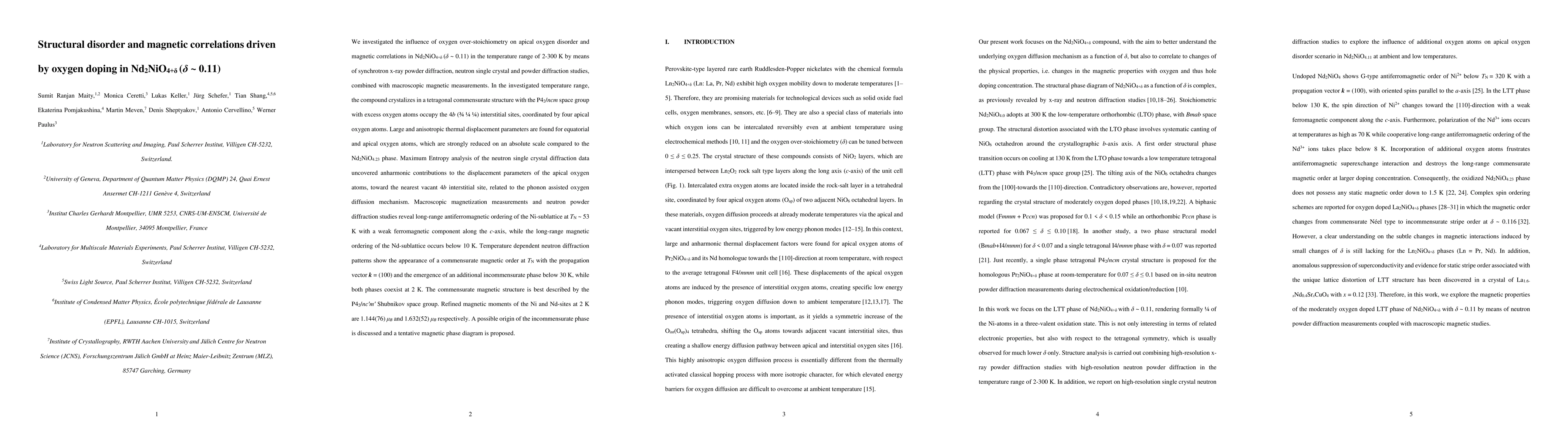 This study investigates the effects of oxygen doping in Nd2NiO4+d, revealing structural disorder and magnetic correlations via synchrotron and neutron diffraction. The compound exhibits long-range antiferromagnetic ordering at 53 K and a weak ferromagnetic component along the c-axis, with an additional incommensurate magnetic phase emerging below 30 K.