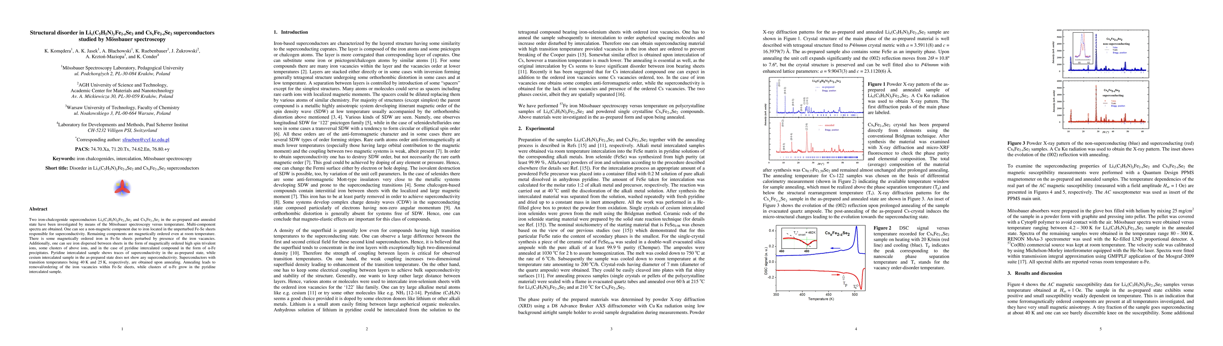 This study uses Mössbauer spectroscopy to investigate structural disorder in Li(x)[C5H5N](y)Fe(2-z)Se2 and Cs(x)Fe(2-z)Se2 superconductors, revealing non-magnetic iron in unperturbed Fe-Se sheets and magnetically ordered iron in perturbed sheets and clusters. Annealing enhances superconductivity and reorganizes iron vacancies.