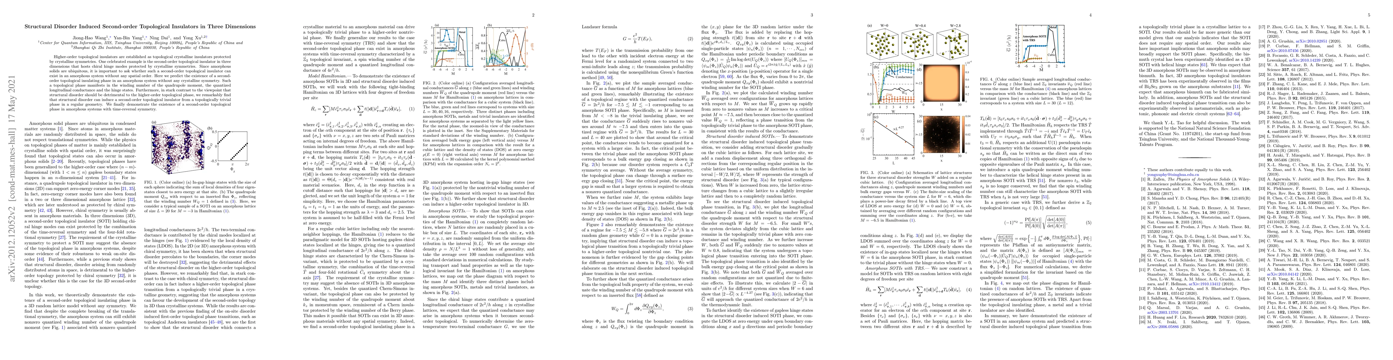 This paper predicts the existence of second-order topological insulating phases in amorphous systems without crystalline symmetry, showing that structural disorder can induce such phases. These phases are characterized by the winding number of the quadrupole moment, quantized longitudinal conductance, and hinge states.