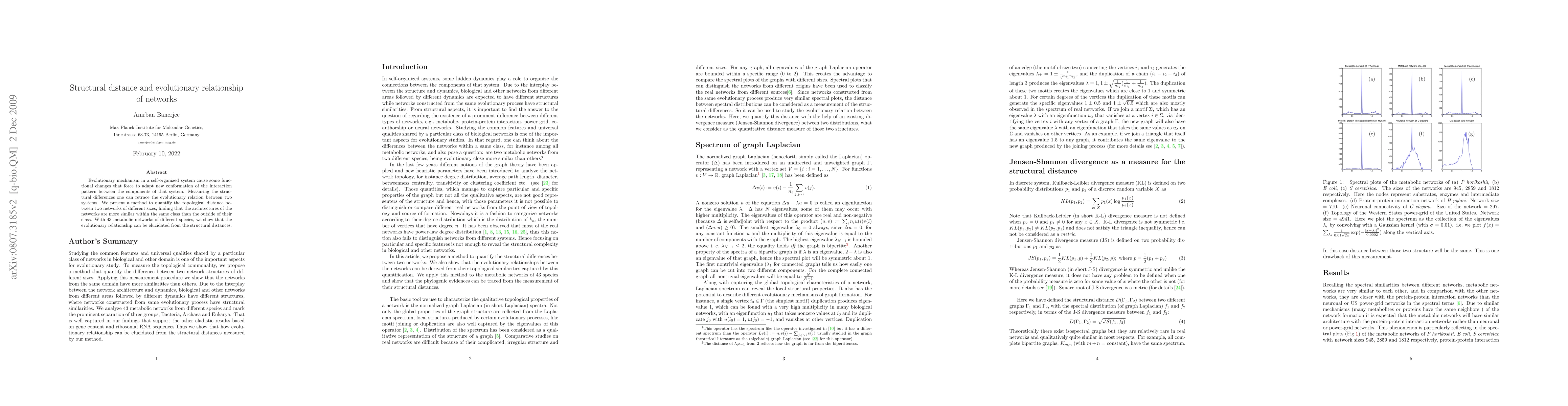 This paper introduces a method to measure structural distance between networks of different sizes, revealing that evolutionary relationships can be elucidated from these distances, with similar architectures within the same class.