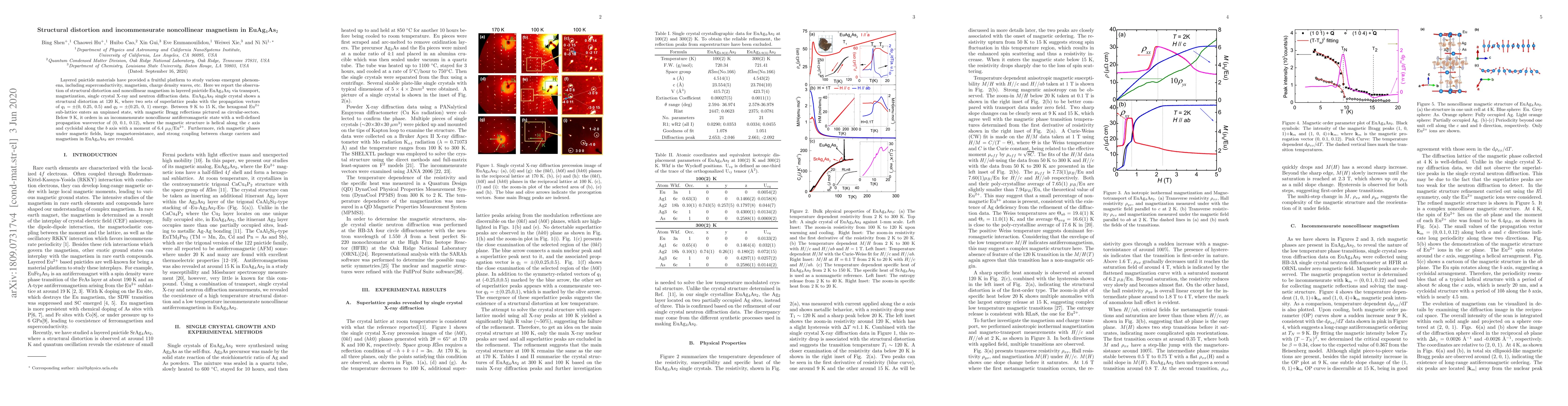 This study reveals structural distortion and incommensurate noncollinear magnetism in EuAg$_4$As$_2$ through various experimental techniques. Below 120 K, the material exhibits a helical and cycloidal magnetic structure with significant magnetoresistance and strong coupling between charge and magnetism.