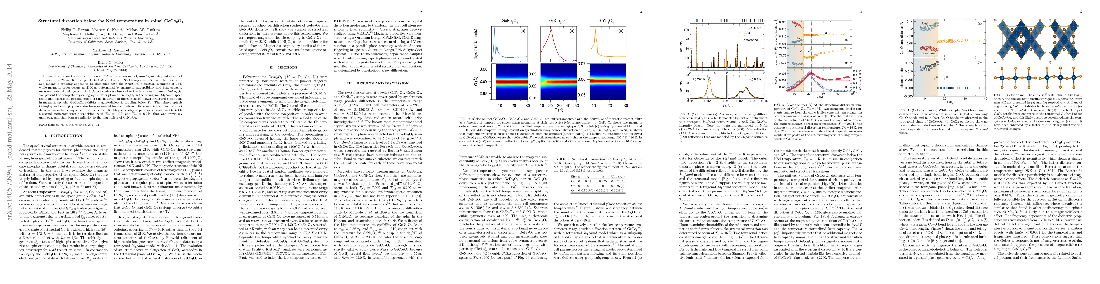 A structural phase transition from cubic $Fd\bar{3}m$ to tetragonal $I$4$_1$/$amd$ symmetry with $c/a >$ 1 is observed at $T_{\rm{S}}$ = 16 K in spinel GeCo$_2$O$_4$ below the N\'eel temperature $T_N$ = 21 K. Structural and magnetic ordering appear to be decoupled with the structural distortion occurring at 16 K while magnetic order occurs at 21 K as determined by magnetic susceptibility and heat capacity measurements. An elongation of CoO$_6$ octahedra is observed in the tetragonal phase of GeCo$_2$O$_4$. We present the complete crystallographic description of GeCo$_2$O$_4$ in the tetragonal $I$4$_1$/$amd$ space group and discuss the possible origin of this distortion in the context of known structural transitions in magnetic spinels. GeCo$_2$O$_4$ exhibits magnetodielectric coupling below $T_{\rm{N}}$. The related spinels GeFe$_2$O$_4$ and GeNi$_2$O$_4$ have also been examined for comparison. Structural transitions were not detected in either compound down to $T \approx$ 8 K. Magnetometry experiments reveal in GeFe$_2$O$_4$ a second antiferromagnetic transition, with $T_{\rm{N1}}$ = 7.9 K and $T_{\rm{N2}}$ = 6.2 K, that was previously unknown, and that bear a similarity to the magnetism of GeNi$_2$O$_4$.