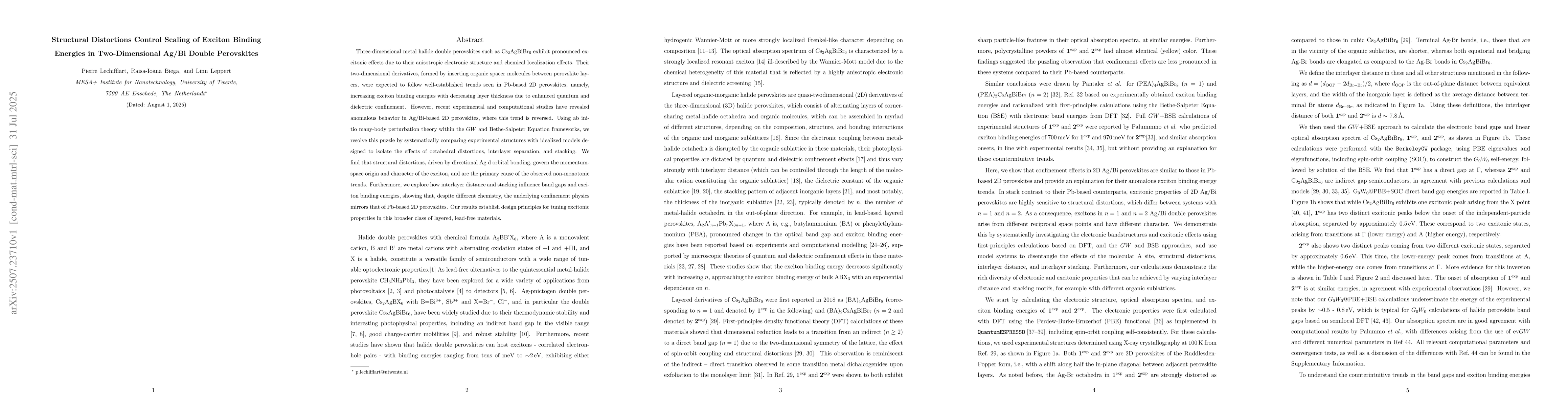 Three-dimensional metal halide double perovskites such as Cs$_2$AgBiBr$_6$ exhibit pronounced excitonic effects due to their anisotropic electronic structure and chemical localization effects. Their two-dimensional derivatives, formed by inserting organic spacer molecules between perovskite layers, were expected to follow well-established trends seen in Pb-based 2D perovskites, namely, increasing exciton binding energies with decreasing layer thickness due to enhanced quantum and dielectric confinement. However, recent experimental and computational studies have revealed anomalous behavior in Ag/Bi-based 2D perovskites, where this trend is reversed. Using ab initio many-body perturbation theory within the $GW$ and Bethe-Salpeter Equation frameworks, we resolve this puzzle by systematically comparing experimental structures with idealized models designed to isolate the effects of octahedral distortions, interlayer separation, and stacking. We find that structural distortions, driven by directional Ag d orbital bonding, govern the momentum-space origin and character of the exciton, and are the primary cause of the observed non-monotonic trends. Furthermore, we explore how interlayer distance and stacking influence band gaps and exciton binding energies, showing that, despite different chemistry, the underlying confinement physics mirrors that of Pb-based 2D perovskites. Our results establish design principles for tuning excitonic properties in this broader class of layered, lead-free materials.