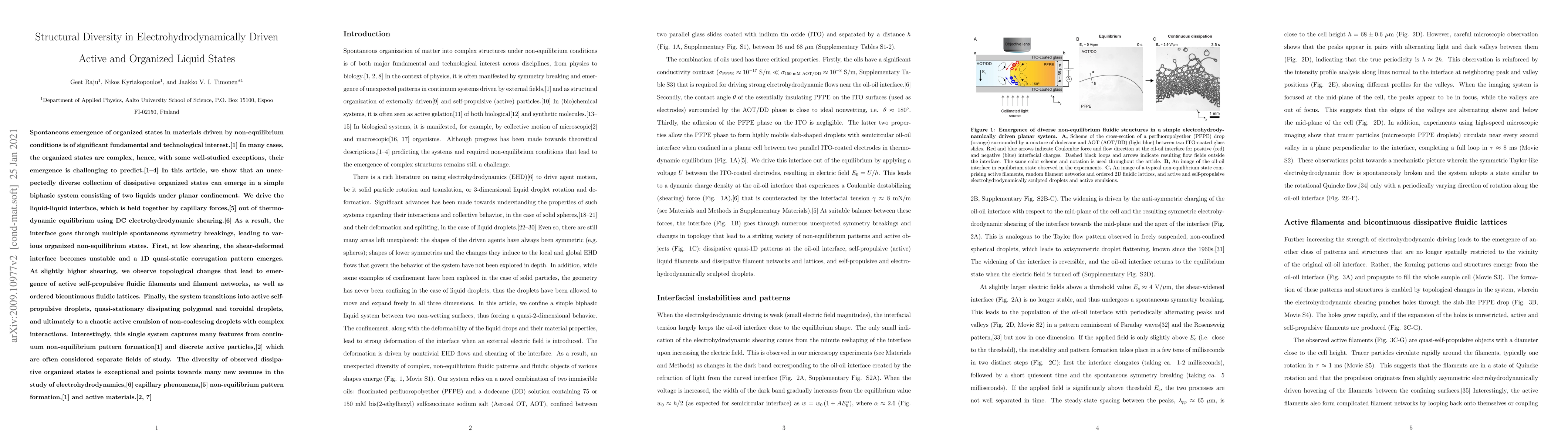This paper explores the emergence of diverse organized non-equilibrium states in a biphasic liquid system under electrohydrodynamic shearing, revealing complex patterns from simple planar confinement. The study highlights the transition from 1D corrugations to active fluidic filaments and self-propulsive droplets, showcasing the rich dynamics of electrohydrodynamically driven active materials.