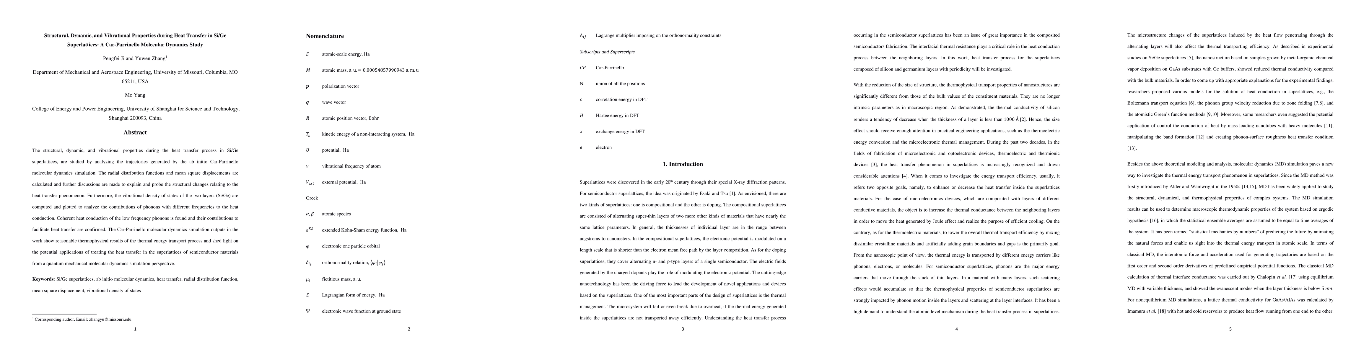 This study uses Car-Parrinello molecular dynamics to investigate the structural, dynamic, and vibrational properties of Si/Ge superlattices during heat transfer, revealing the role of low-frequency phonons in coherent heat conduction and providing insights into thermal energy transport in semiconductor superlattices.