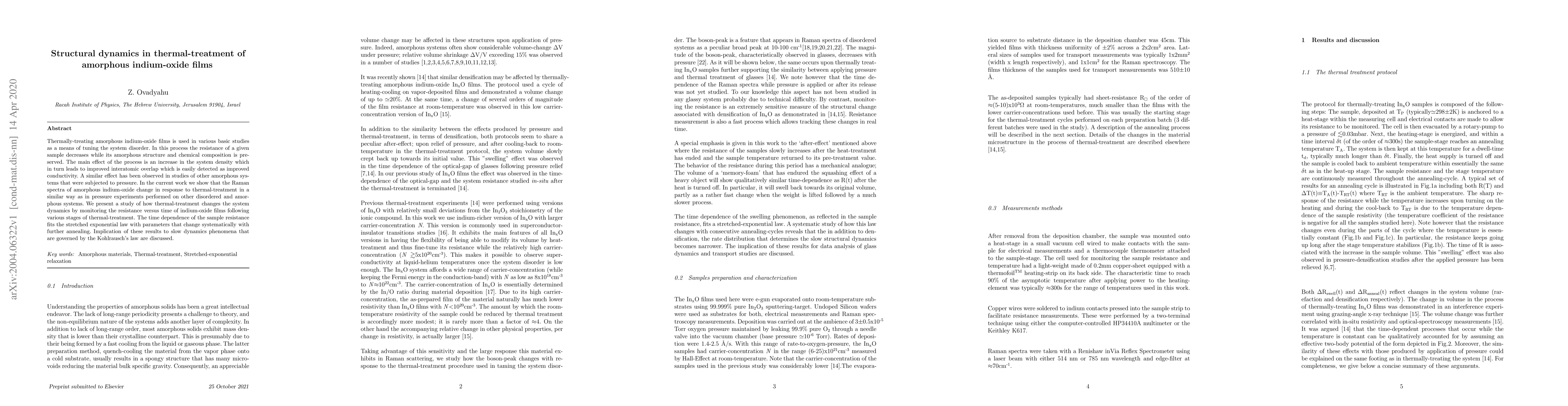 Thermally-treating amorphous indium-oxide films is used in various basic studies as a means of tuning the system disorder. In this process the resistance of a given sample decreases while its amorphous structure and chemical composition is preserved. The main effect of the process is an increase in the system density which in turn leads to improved interatomic overlap which is easily detected as improved conductivity. A similar effect has been observed in studies of other amorphous systems that were subjected to pressure. In the current work we show that the Raman spectra of amorphous indium-oxide change in response to thermal-treatment in a similar way as in pressure experiments performed on other disordered and amorphous systems. We present a study of how thermal-treatment changes the system dynamics by monitoring the resistance versus time of indium-oxide films following various stages of thermal-treatment. The time dependence of the sample resistance fits the stretched exponential law with parameters that change systematically with further annealing. Implication of these results to slow dynamics phenomena that are governed by the Kohlrausch's law are discussed.