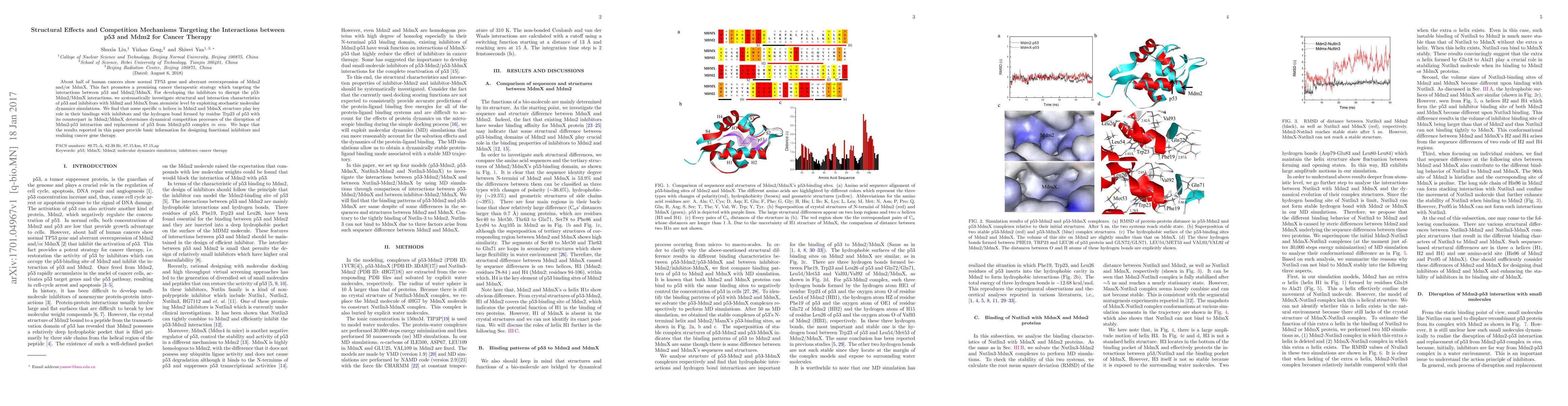 This paper investigates the structural characteristics and competition mechanisms of p53-Mdm2/MdmX interactions using molecular dynamics simulations. It identifies specific $\alpha$ helices in Mdm2 and MdmX crucial for inhibitor binding and highlights the role of a hydrogen bond involving Trp23 of p53 in disrupting Mdm2-p53 complexes, offering insights for cancer therapy development.