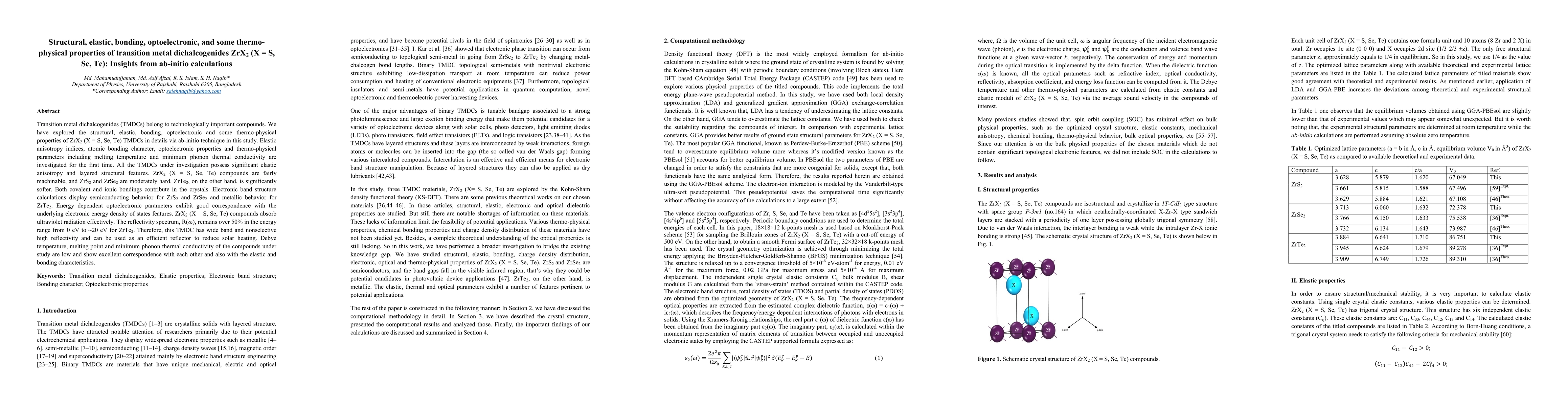 This study investigates the structural, elastic, bonding, optoelectronic, and thermo-physical properties of ZrX2 (X = S, Se, Te) transition metal dichalcogenides using ab-initio calculations. The compounds exhibit significant elastic anisotropy and layered structures, with ZrS2 and ZrSe2 being moderately hard and ZrTe2 softer, while all absorb ultraviolet radiation effectively.