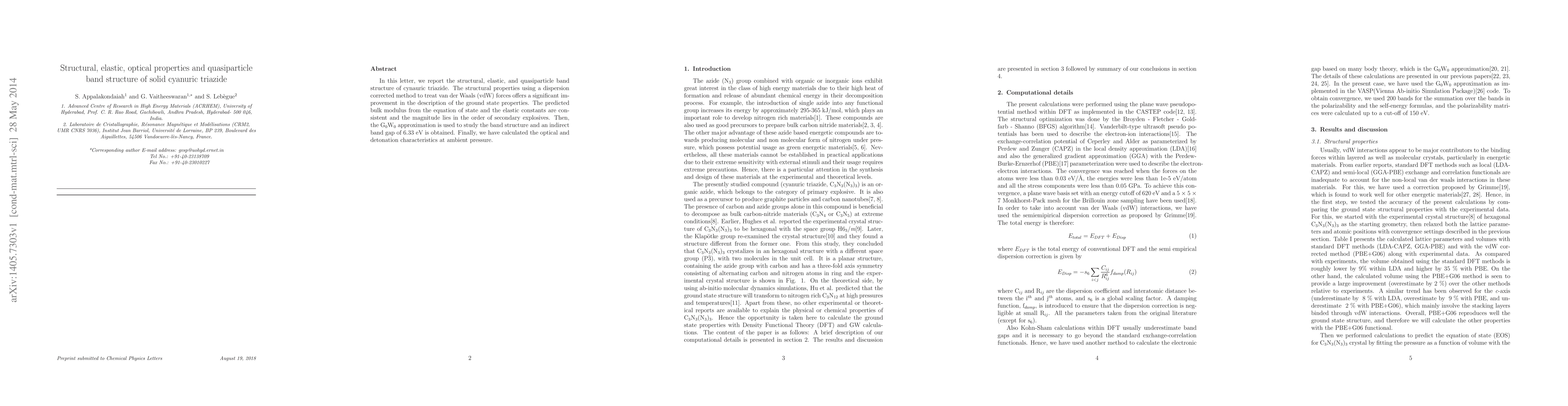 Researchers studied the structural, elastic, optical properties and band structure of solid cyanuric triazide, finding a predicted bulk modulus similar to that of secondary explosives and an indirect band gap of 6.33 eV.