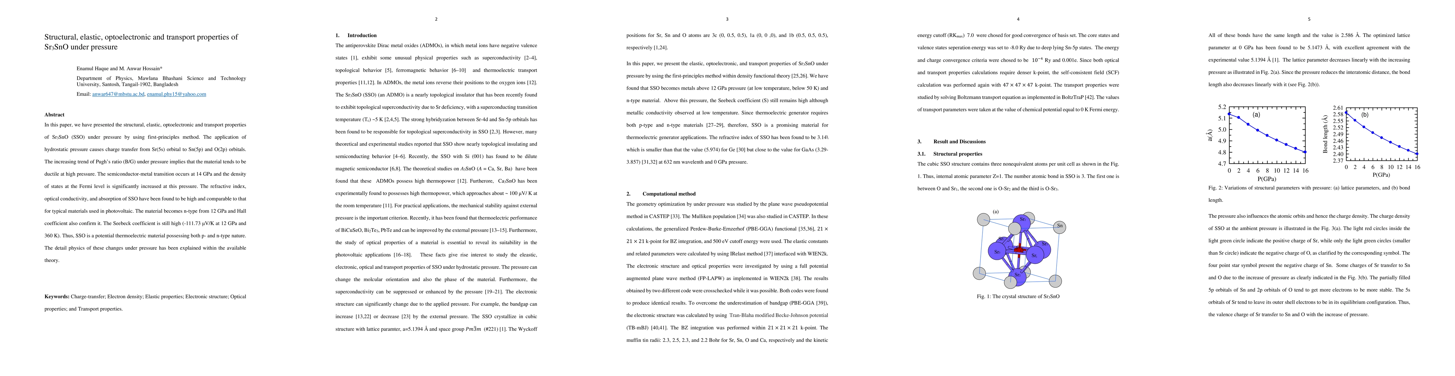 Sr3SnO undergoes a semiconductor-metal transition at 14 GPa under hydrostatic pressure, showing increased ductility and significant changes in optoelectronic and transport properties, making it a potential thermoelectric material. The pressure-induced charge transfer and enhanced density of states at the Fermi level contribute to its high refractive index and optical conductivity.