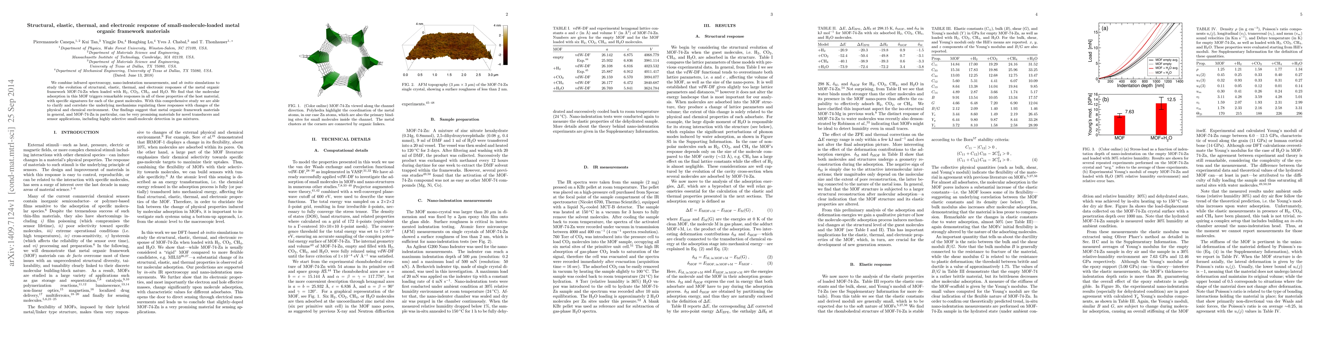 This paper investigates the structural, elastic, thermal, and electronic responses of MOF-74-Zn when loaded with H$_2$, CO$_2$, CH$_4$, and H$_2$O using a combination of infrared spectroscopy, nano-indentation, and \emph{ab initio} simulations. The study reveals distinct signatures of molecular adsorption in the framework, suggesting MOF-74-Zn's potential for advanced sensor and transducer applications.