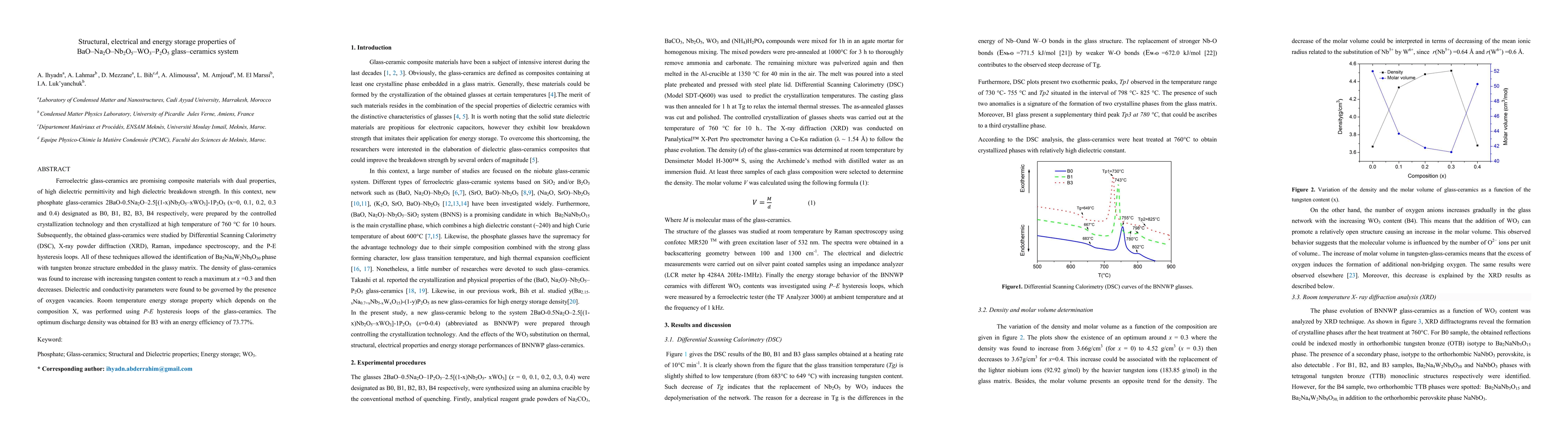 Ferroelectric glass-ceramics are promising composite materials with dual properties, of high dielectric permittivity and high dielectric breakdown strength. In this context, new phosphate glass-ceramics 2BaO-0.5Na2O 2.5[(1-x)Nb2O5 xWO3]-1P2O5 (x=0, 0.1, 0.2, 0.3 and 0.4) designated as B0, B1, B2, B3, B4 respectively, were prepared by the controlled crystallization technology and then crystallized at high temperature of 760 {\deg}C for 10 hours. Subsequently, the obtained glass-ceramics were studied by Differential Scanning Calorimetry (DSC), X-ray powder diffraction (XRD), Raman, impedance spectroscopy, and the P-E hysteresis loops. All of these techniques allowed the identification of Ba2Na4W2Nb8O30 phase with tungsten bronze structure embedded in the glassy matrix. The density of glass-ceramics was found to increase with increasing tungsten content to reach a maximum at x =0.3 and then decreases. Dielectric and conductivity parameters were found to be governed by the presence of oxygen vacancies. Room temperature energy storage property which depends on the composition X, was performed using P-E hysteresis loops of the glass-ceramics. The optimum discharge density was obtained for B3 with an energy efficiency of 73.77%.