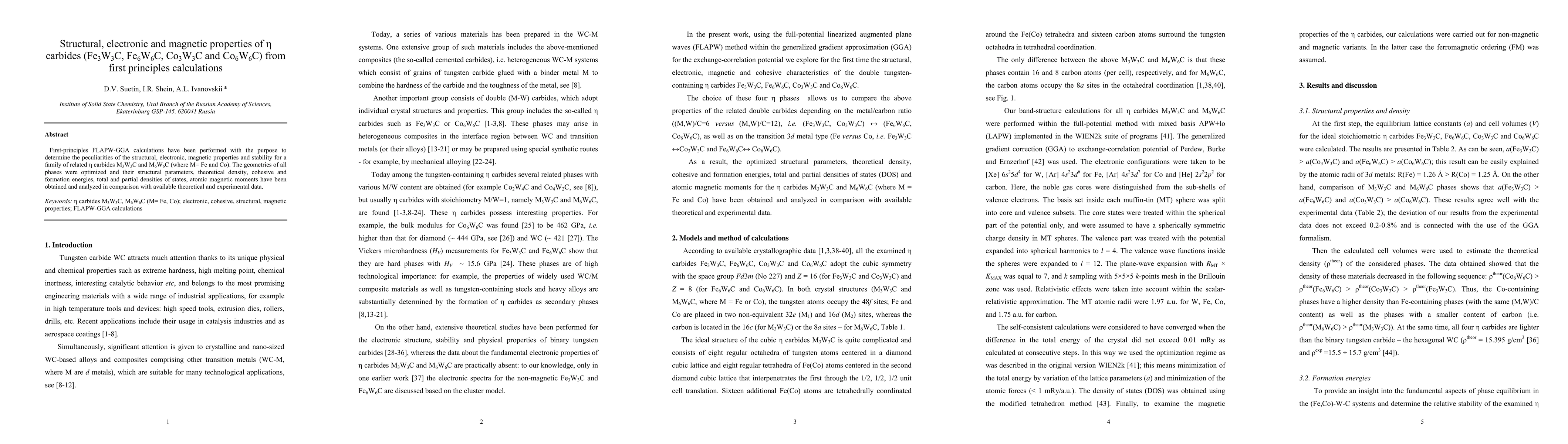 First-principles FLAPW-GGA calculations have been performed with the purpose to determine the peculiarities of the structural, electronic, magnetic properties and stability for a family of related ether carbides M3W3C and M6W6C (where M= Fe and Co). The geometries of all phases were optimized and their structural parameters, theoretical density, cohesive and formation energies, total and partial densities of states, atomic magnetic moments have been obtained and analyzed in comparison with available theoretical and experimental data.