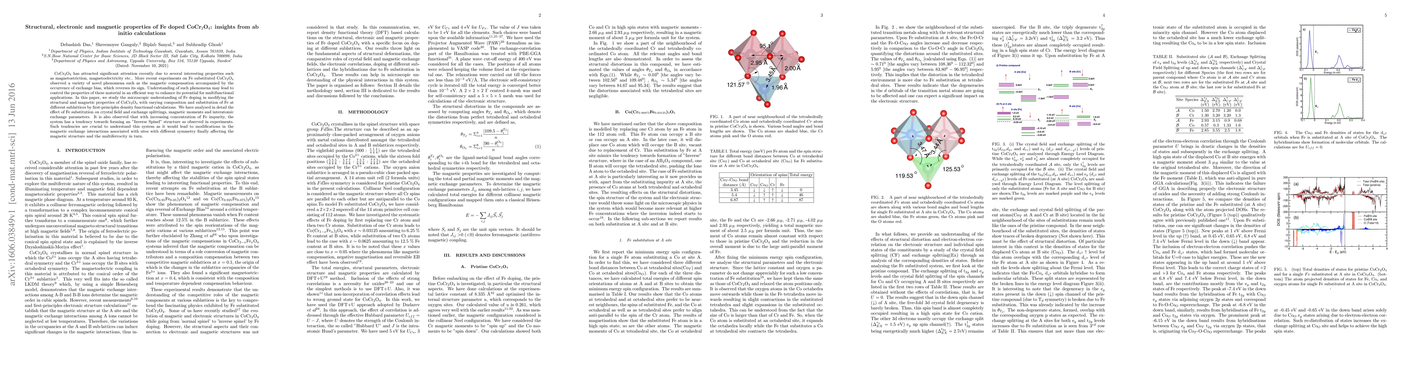 CoCr$_2$O$_4$ has attracted significant attention recently due to several interesting properties such as magnetostriction, magnetoelectricity etc.. More recent experiments on Fe substituted CoCr$_2$O$_4$ observed a variety of novel phenomena such as the magnetic compensation accompanied by the occurrence of exchange bias, which reverses its sign. Understanding of such phenomena may lead to control the properties of these material in an efficient way to enhance its potential for multifunctional applications. In this paper, we study the microscopic understanding of Fe doping in modifying the structural and magnetic properties of CoCr$_{2}$O$_{4}$ with varying composition and substitution of Fe at different sublattices by first-principles density functional calculations. We have analysed in detail the effect of Fe substitution on crystal field and exchange splittings, magnetic moments and interatomic exchange parameters. It is also observed that with increasing concentration of Fe impurity, the system has a tendency towards forming an "Inverse Spinel" structure as observed in experiments. Such tendencies are crucial to understand this system as it would lead to modifications in the magnetic exchange interactions associated with sites with different symmetry finally affecting the magnetic structure and the multiferrocity in turn.
