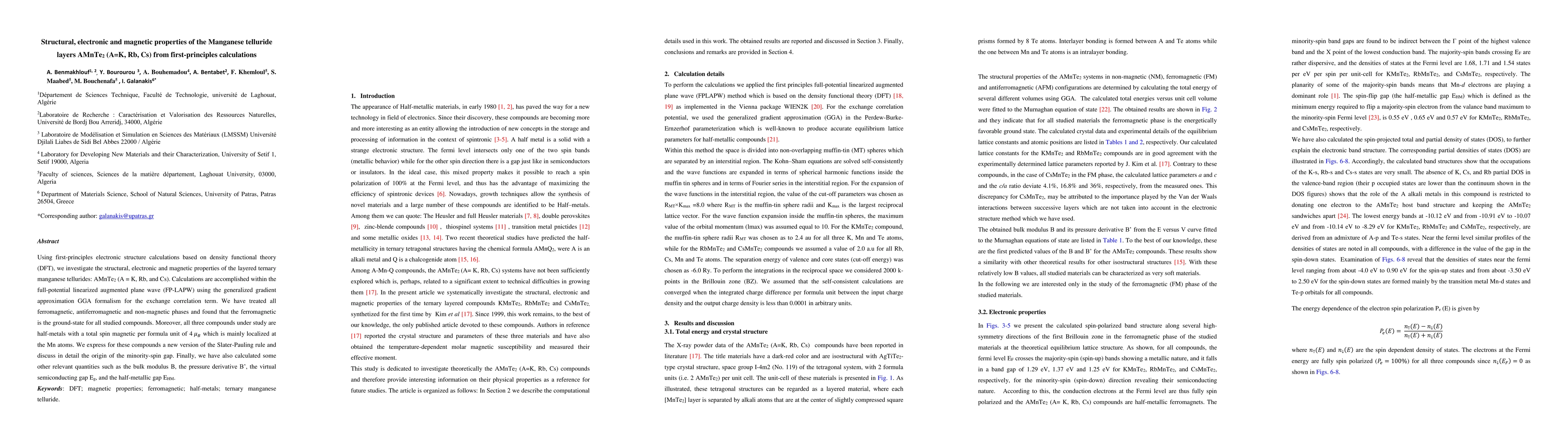 This paper uses first-principles DFT calculations to explore the structural, electronic, and magnetic properties of layered manganese tellurides AMnTe2 (A = K, Rb, Cs). The study finds that the ferromagnetic phase is the ground state for all compounds, which are also half-metals with a spin magnetic moment of 4 μB per formula unit, primarily localized at Mn atoms.