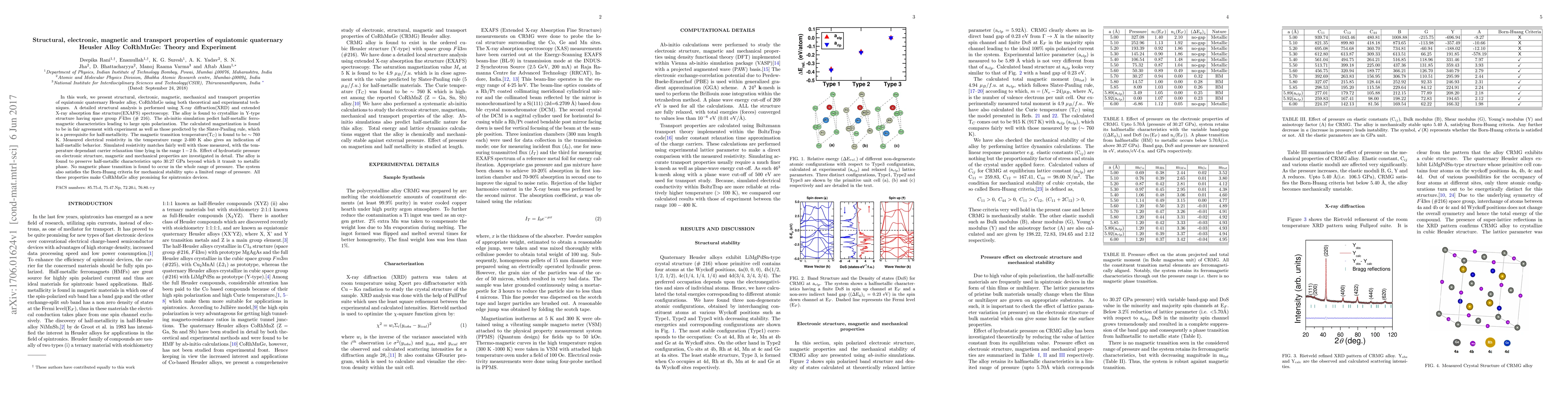 This study investigates the structural, electronic, magnetic, and transport properties of the equiatomic quaternary Heusler alloy CoRhMnGe using both theoretical and experimental methods. The alloy exhibits half-metallic ferromagnetic characteristics, with a magnetic transition temperature of ~760 K, and maintains these properties under pressure up to 30.27 GPa, making it a promising candidate for spintronics applications.