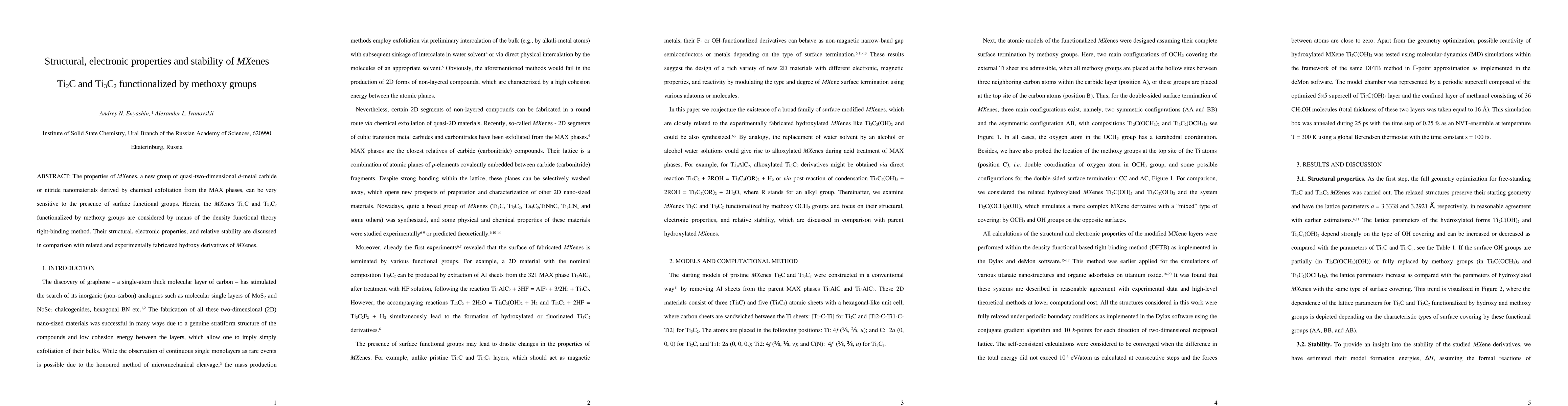This study investigates the structural, electronic properties, and stability of methoxy-functionalized MXenes Ti2C and Ti3C2 using density functional theory tight-binding. The research compares these functionalized MXenes with their hydroxy counterparts to understand the impact of surface functional groups.