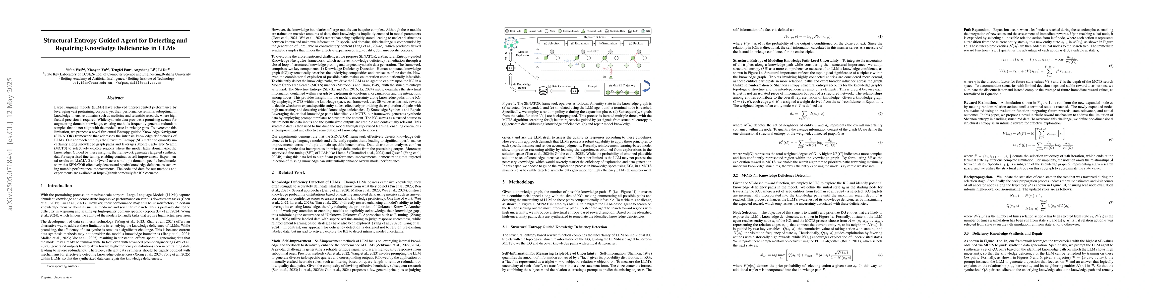 Large language models (LLMs) have achieved unprecedented performance by leveraging vast pretraining corpora, yet their performance remains suboptimal in knowledge-intensive domains such as medicine and scientific research, where high factual precision is required. While synthetic data provides a promising avenue for augmenting domain knowledge, existing methods frequently generate redundant samples that do not align with the model's true knowledge gaps. To overcome this limitation, we propose a novel Structural Entropy-guided Knowledge Navigator (SENATOR) framework that addresses the intrinsic knowledge deficiencies of LLMs. Our approach employs the Structure Entropy (SE) metric to quantify uncertainty along knowledge graph paths and leverages Monte Carlo Tree Search (MCTS) to selectively explore regions where the model lacks domain-specific knowledge. Guided by these insights, the framework generates targeted synthetic data for supervised fine-tuning, enabling continuous self-improvement. Experimental results on LLaMA-3 and Qwen2 across multiple domain-specific benchmarks show that SENATOR effectively detects and repairs knowledge deficiencies, achieving notable performance improvements. The code and data for our methods and experiments are available at https://github.com/weiyifan1023/senator.