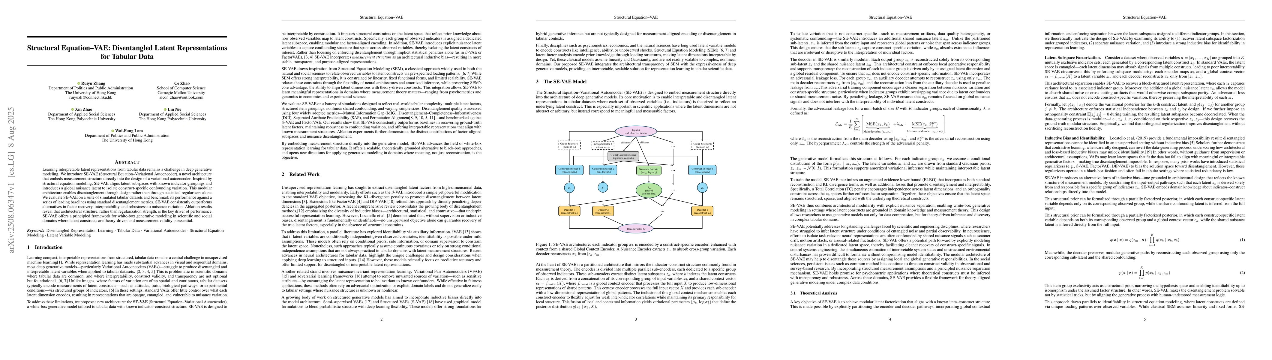 The research introduces SE-VAE, a Structural Equation-Variational Autoencoder that embeds measurement structure directly into a variational autoencoder's design, inspired by structural equation modeling. It aligns latent subspaces with known indicator groupings and introduces a global nuisance latent to isolate construct-specific confounding variation.