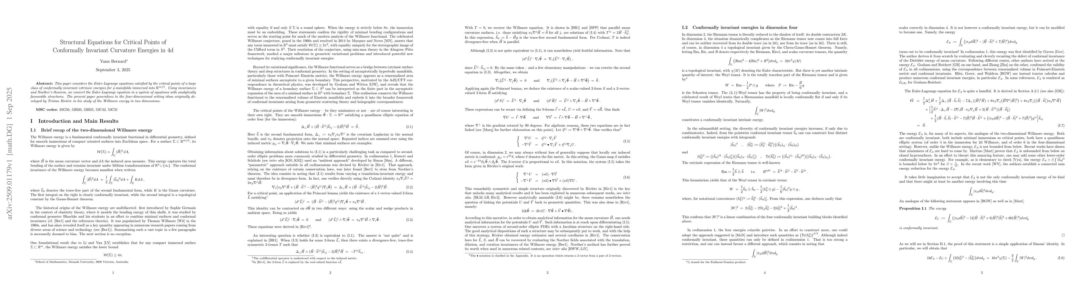 This paper considers the Euler-Lagrange equations satisfied by the critical points of a large class of conformally invariant extrinsic energies for 4-manifolds immersed into Euclidean space (any codimension). Using invariances and Noether's theorem, we convert the Euler-Lagrange equation in a system of equations with analytically favourable structures. The present paper generalises to the four-dimensional setting ideas originally developed by Tristan Rivi\`ere in his study of the Willmore energy in two dimensions.