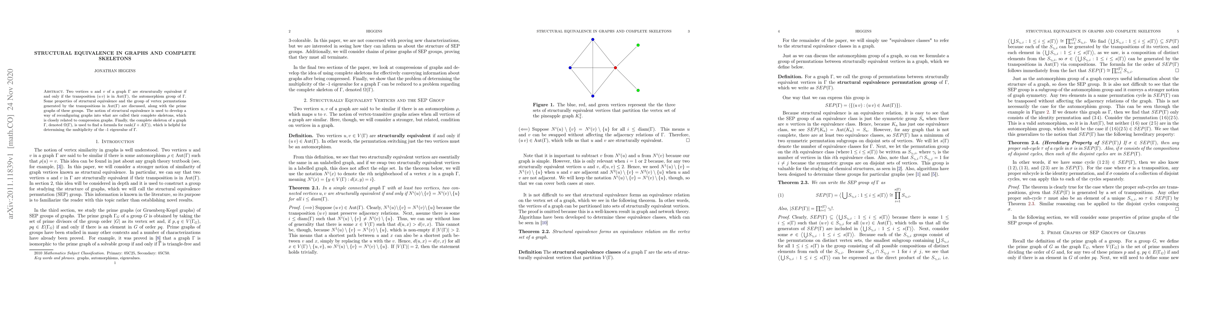 Two vertices $u$ and $v$ of a graph $\Gamma$ are strucuturally equivalent if and only if the transposition $(u\,v)$ is in Aut($\Gamma$), the automorphism group of $\Gamma$. Some properties of structural equivalence and the group of vertex permutations generated by the transpositions in Aut($\Gamma$) are discussed, along with the prime graphs of these groups. The notion of structural equivalence is used to develop a way of reconfiguring graphs into what are called their complete skeletons, which is closely related to compression graphs. Finally, the complete skeleton of a graph $\Gamma$, denoted $\Omega(\Gamma)$, is used to find a formula for rank$(I+A(\Gamma))$, which is helpful for determining the multiplicity of the -1 eigenvalue of $\Gamma$.