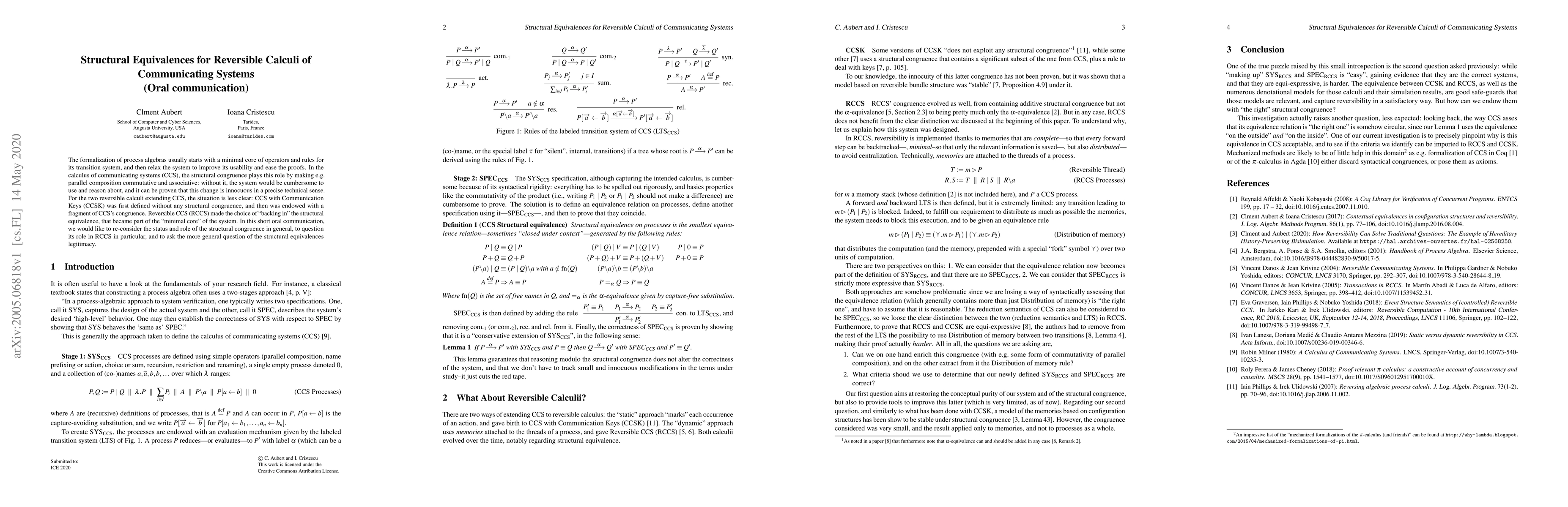 The formalization of process algebras usually starts with a minimal core of operators and rules for its transition system, and then relax the system to improve its usability and ease the proofs. In the calculus of communicating systems (CCS), the structural congruence plays this role by making e.g. parallel composition commutative and associative: without it, the system would be cumbersome to use and reason about, and it can be proven that this change is innocuous in a precise technical sense. For the two reversible calculi extending CCS, the situation is less clear: CCS with Communication Keys (CCSK) was first defined without any structural congruence, and then was endowed with a fragment of CCS's congruence. Reversible CCS (RCCS) made the choice of "backing in" the structural equivalence, that became part of the "minimal core" of the system. In this short oral communication, we would like to re-consider the status and role of the structural congruence in general, to question its role in RCCS in particular, and to ask the more general question of the structural equivalences legitimacy.