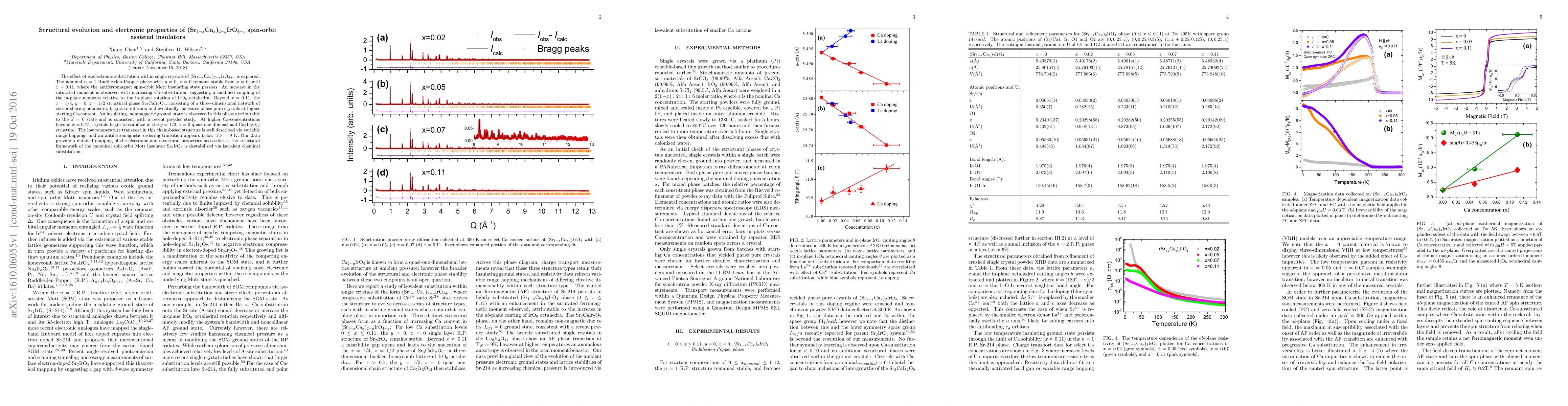 The research examines the structural and electronic changes in (Sr1-xCax)2-yIrO4+z crystals with Ca substitution. It finds a stable n=1 phase up to x=0.11, with increasing moment due to altered IrO6 octahedra coupling. Beyond x=0.11, a new phase (Sr3CaIr2O9) emerges, exhibiting an insulating, nonmagnetic state. Higher Ca content leads to a quasi one-dimensional Ca5Ir3O12 structure with variable range hopping and antiferromagnetic ordering below T_N=9 K.