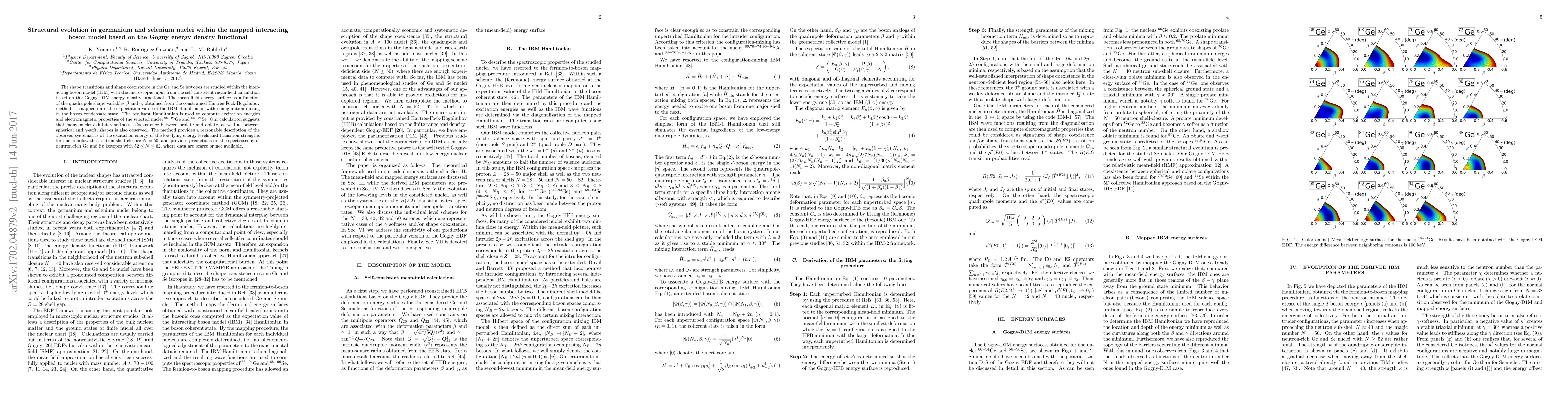 This paper investigates the shape transitions and coexistence in germanium and selenium isotopes using the interacting boson model with microscopic input from the Gogny-D1M energy density functional. The study reveals $\gamma$ softness and coexistence between different shapes, providing a good description of low-lying excitation energies and transition strengths for nuclei below the neutron shell closure $N=50$.